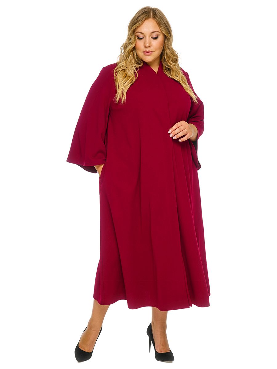 Удлиненный свободный кардиган  в стиле "кимоно" из крепа с эластаном. Скругленный край борта спереди плавно переходит в аккуратную цельнокроенную стойку на спинке, подчеркивая изящество  линий. Рукав расклешенный. Застежка на 2 кнопки. Завязывается на пояс в тон основной ткани.
