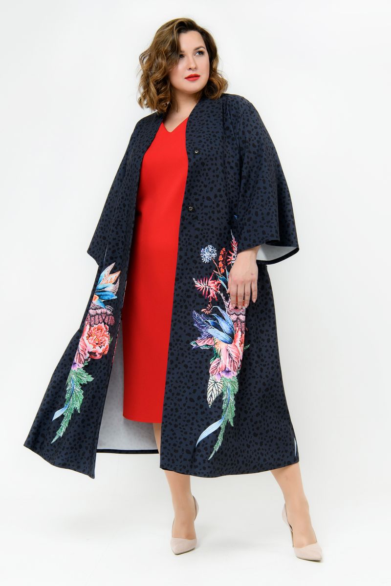 Удлиненный свободный кардиган  в стиле "кимоно" из крепа с эластаном.  Скругленный край борта спереди плавно переходит в аккуратную цельнокроенную стойку на спинке.