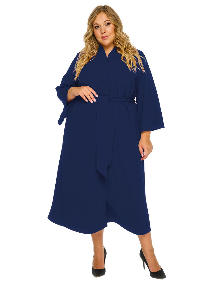 Удлиненный свободный кардиган  в стиле "кимоно" из крепа с эластаном. обработкой. Скругленный край борта спереди плавно переходит в аккуратную цельнокроенную стойку на спинке, подчеркивая изящество  линий. Рукав расклешенный. Застежка на 2 кнопки. Завязывается на пояс в тон основной ткани.