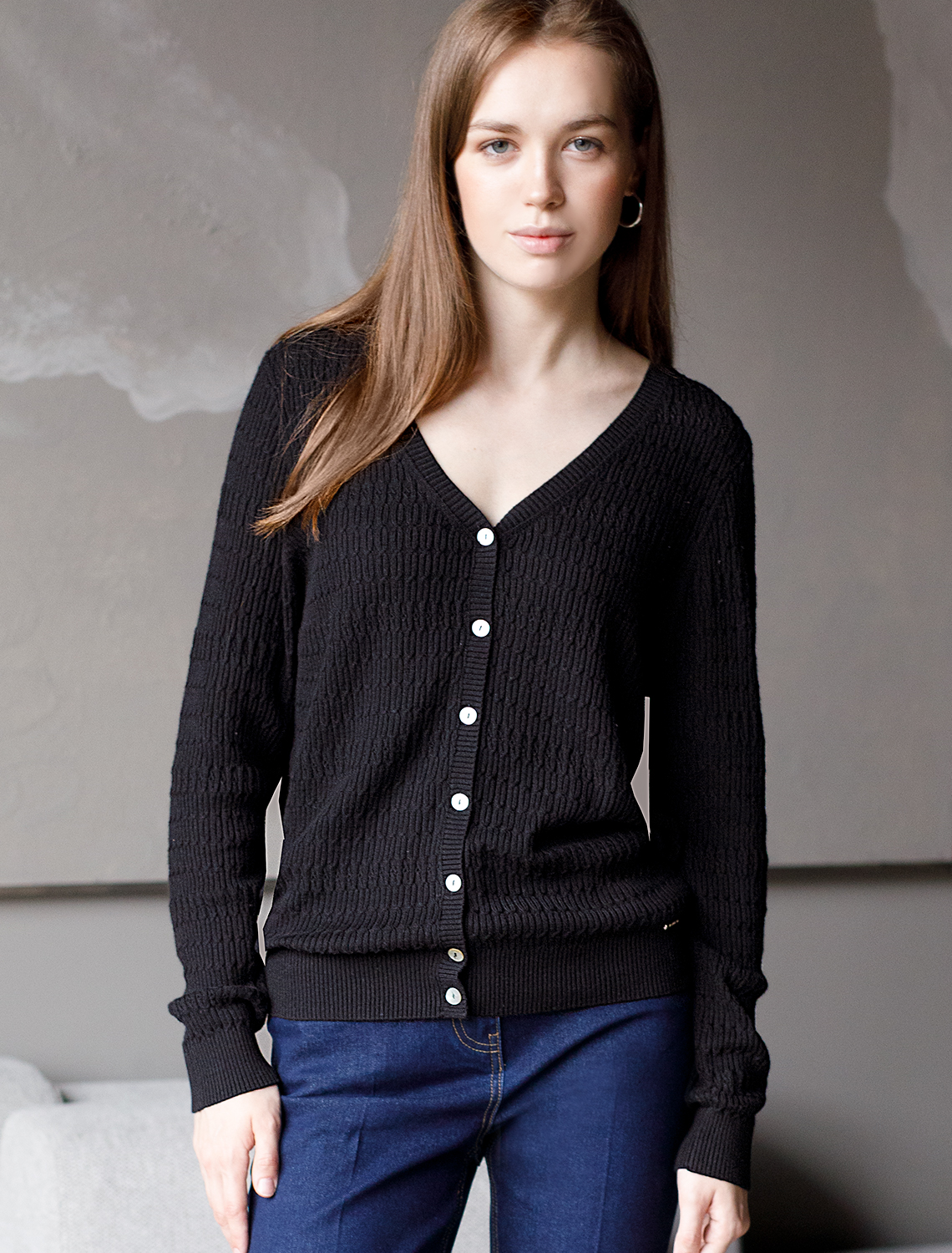 Кардиган тонкой вязки выполнен из хлопка с вискозой. Нежную пряжу, очень приятную к телу, дополняет ажурный узор - плетение косы напоминающий звенья колец. Застежка на пуговицы из натурального перламутра. Модель отлично впишется в весенний и летний гардероб, как самостоятельный верх или накидка на топ или платье. Комфортная длина и крой подходят для любой фигуры. 60%Хлопок 30%Вис 10%ПА