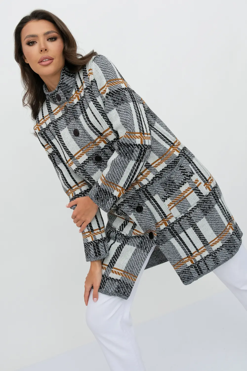 Женский эффектный вязанный кардиган прямого силуэта. Воротник-стойка. Застегивается на пуговицы Рукава втачные длинные. Два накладных кармана. Кардиган выполнен жаккардовым переплетением образующим геометрический рисунок "клетка".  Он согреет вас в прохладный день и подарит ощущение невероятного комфорта.