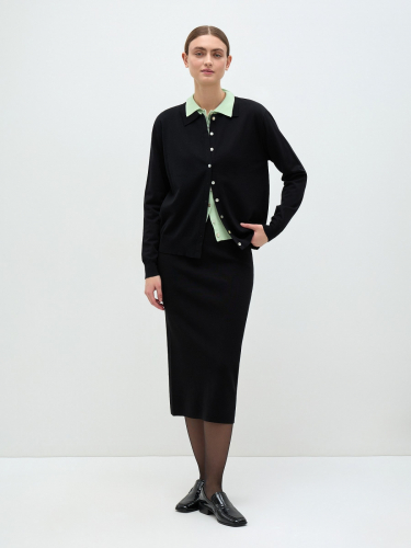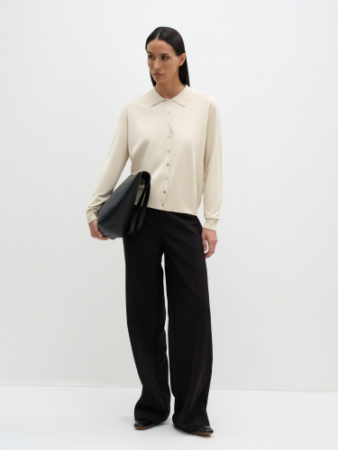 Базовый кардиган с отложным воротником – актуальная альтернатива рубашке. Та же лаконичность, функциональность и максимальная вариативность стилизации. Модель выполнена из легкого вискозного полотна гладкого плетения, в прямом свободном силуэте. Манжеты и низ оформлены эластичной резинкой. Кардиган застегивается на перламутровые пуговицы, которые делают его еще нежнее и изящнее.