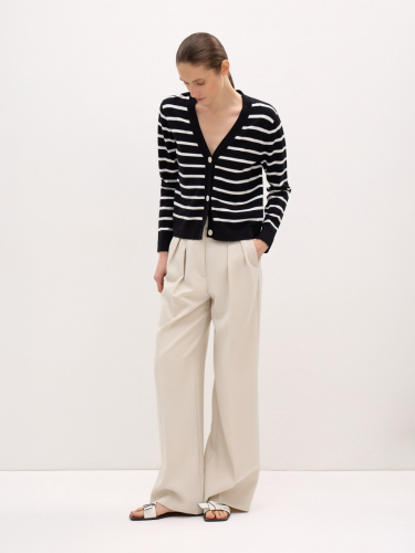 Свободный джемпер с глубоким V-образным вырезом в актуальной эстетике "тихая роскошь". Аристократичный характер модели определяет симметричный принт в полоску и крупные нейтральные пуговицы. Свободный прямой фит и чуть спущенное плечо смягчают линии и повышают адаптивность посадки. Для модели выбрано среднеплотное вискозное полотно гладкого плетения, поэтому вам не будет жарко даже в теплую погоду.