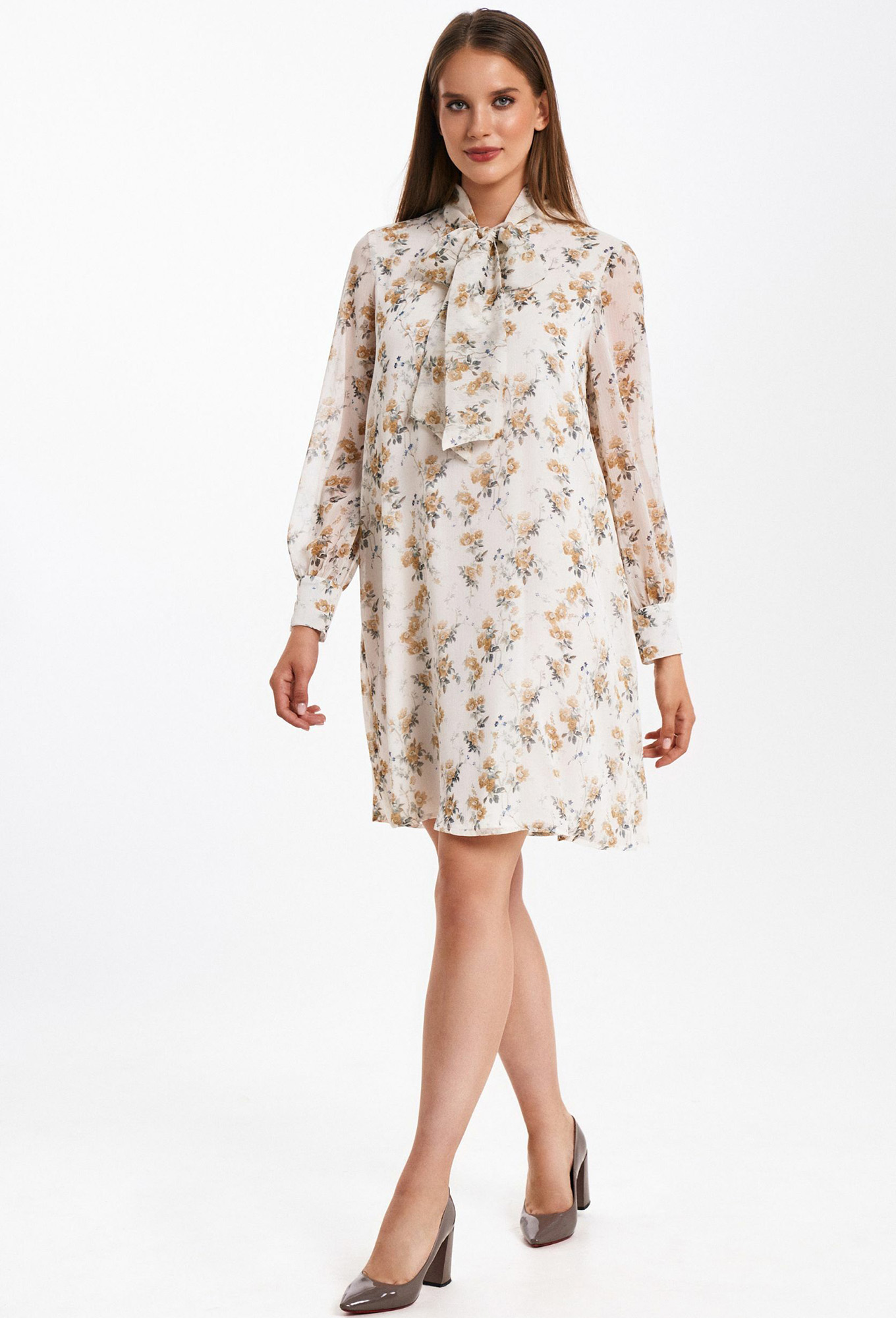 Платье свободного силуэта, расширенное к низу, выполнено из шифонового полотна с воротником-стойкой переходящим в бант. Рукава в изделии втачные одношовные со сборкой по низу с отрезной манжетой на 3 петли и пуговицы. Платье на подкладке.