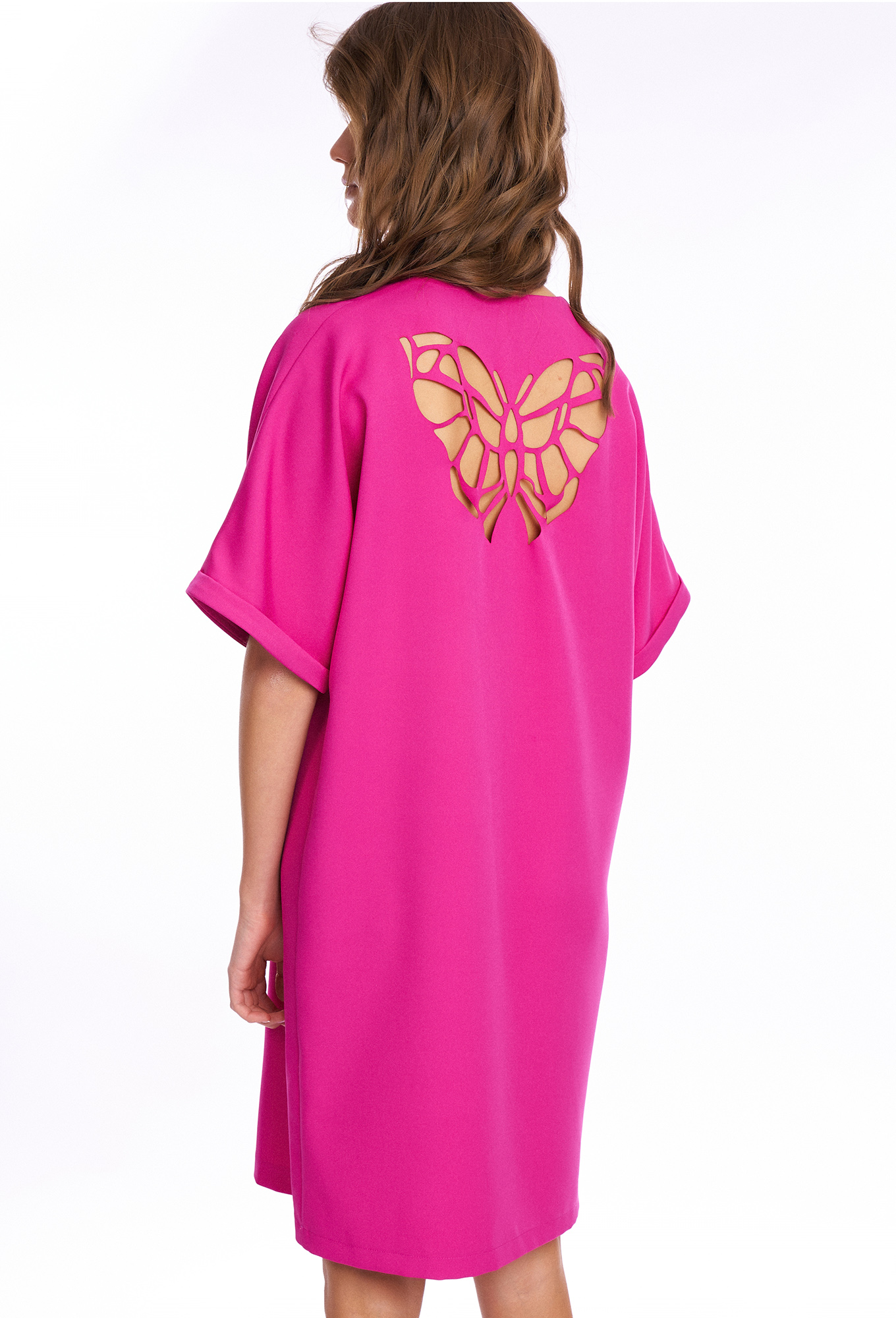 Платье женское свободного кроя, прямого силуэта с цельнокроеным рукавом. Горловина V-образной формы . Спинка с перфорацией - бабочка.Платье длиной до линии колена, рукава с отложными манжетами.
