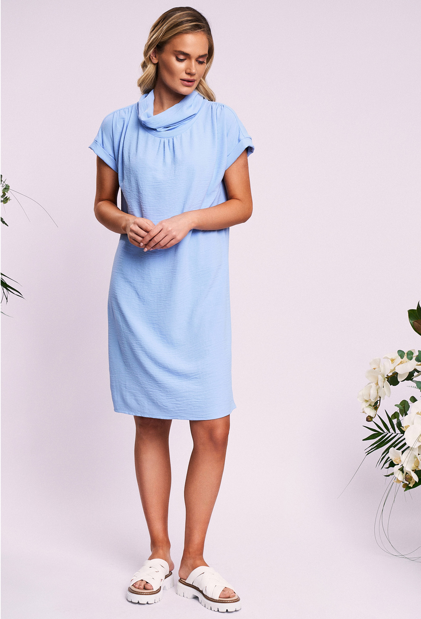 Комфортное платье прямого силуэта, умеренного объема длиной до колена. Перед платья со сборками из плеча и горловины. Спинка с горизонтальной кокеткой и сборкой по центру. Рукав цельнокроеный с отложными манжетами, короткий. Воротник стойка спереди образует качель за счет мягкости ткани, сзади с защипами по среднему шву.