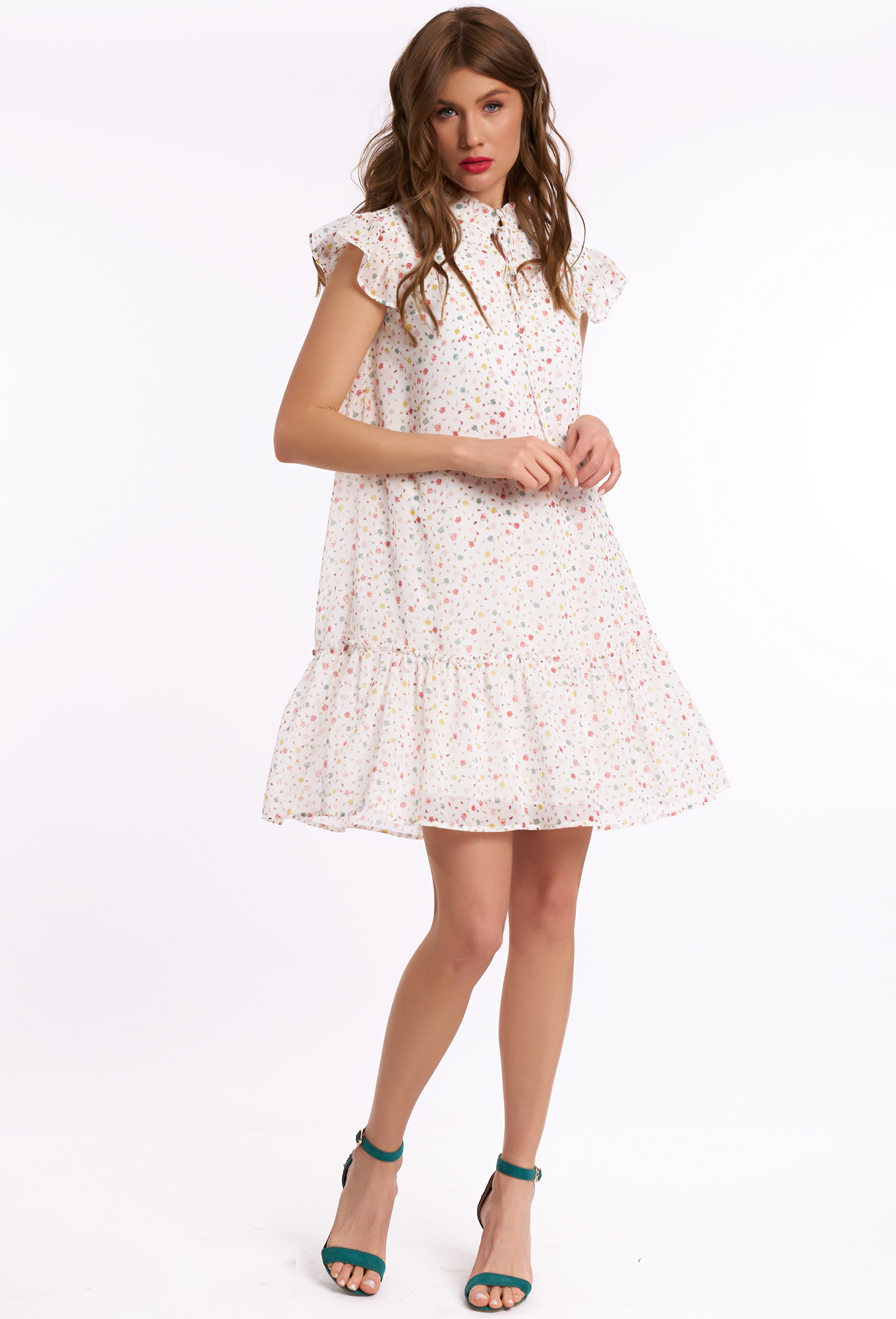 Лёгкое женское платье умеренного объема, расширенное к низу. Перед с разрезом по горловине. Рукав «крылышко» на сборке. Воротник стойка с притачной рюшей по верху и завязками. Низ платья с настрочным воланом. Платье на вискозной подкладке, длиной до линии колена.