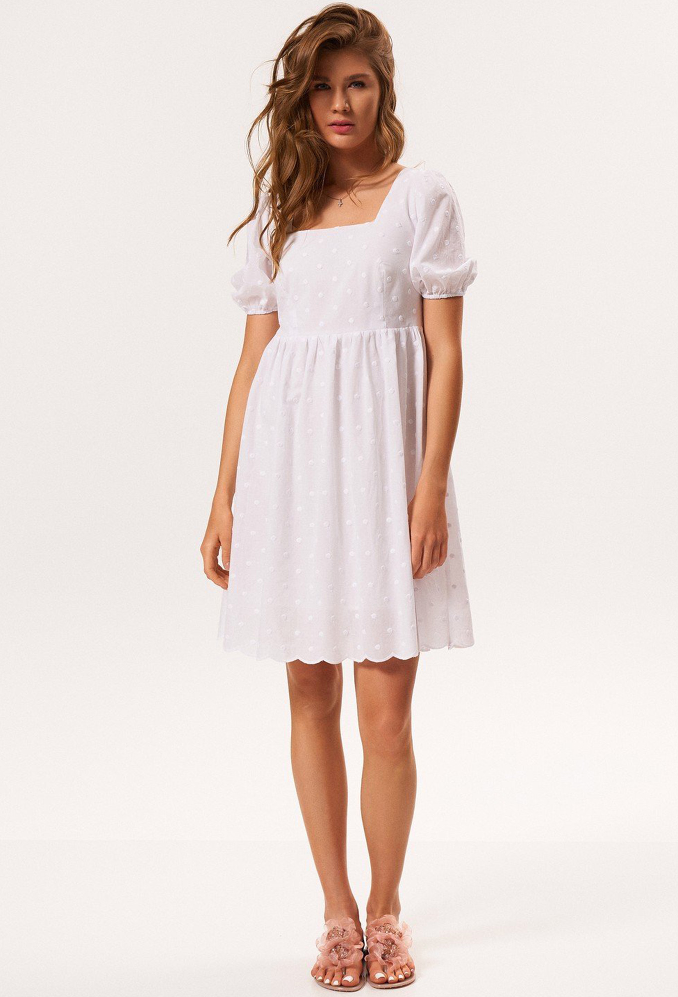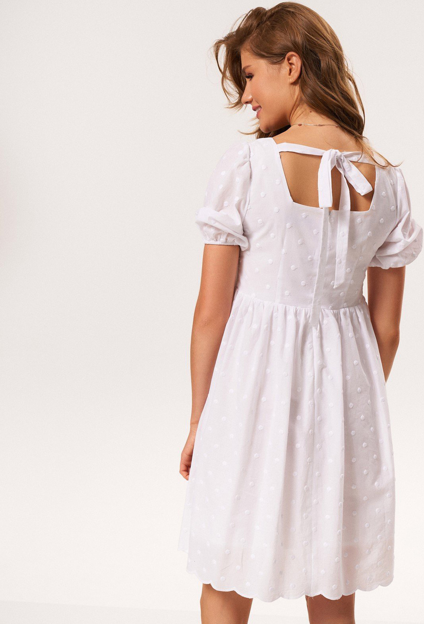 Лёгкое женское платье полуприлегающего силуэта, отрезное по линии талии. Лиф платья малого объема за счет талиевых вытачек. Линия талии завышена. Вырез горловины широкий прямоугольной формы. Юбка большого объема со сборкой по линии талии. Платье с застежкой на потайную тесьму «молнию» по спинке в среднем шве. В вырез по спинке на уровне лопаток вставлено две завязки, которые фиксируют детали спинки. Рукав втачной со сборкой по линии оката. Низ рукава собран на эластичную тесьму.