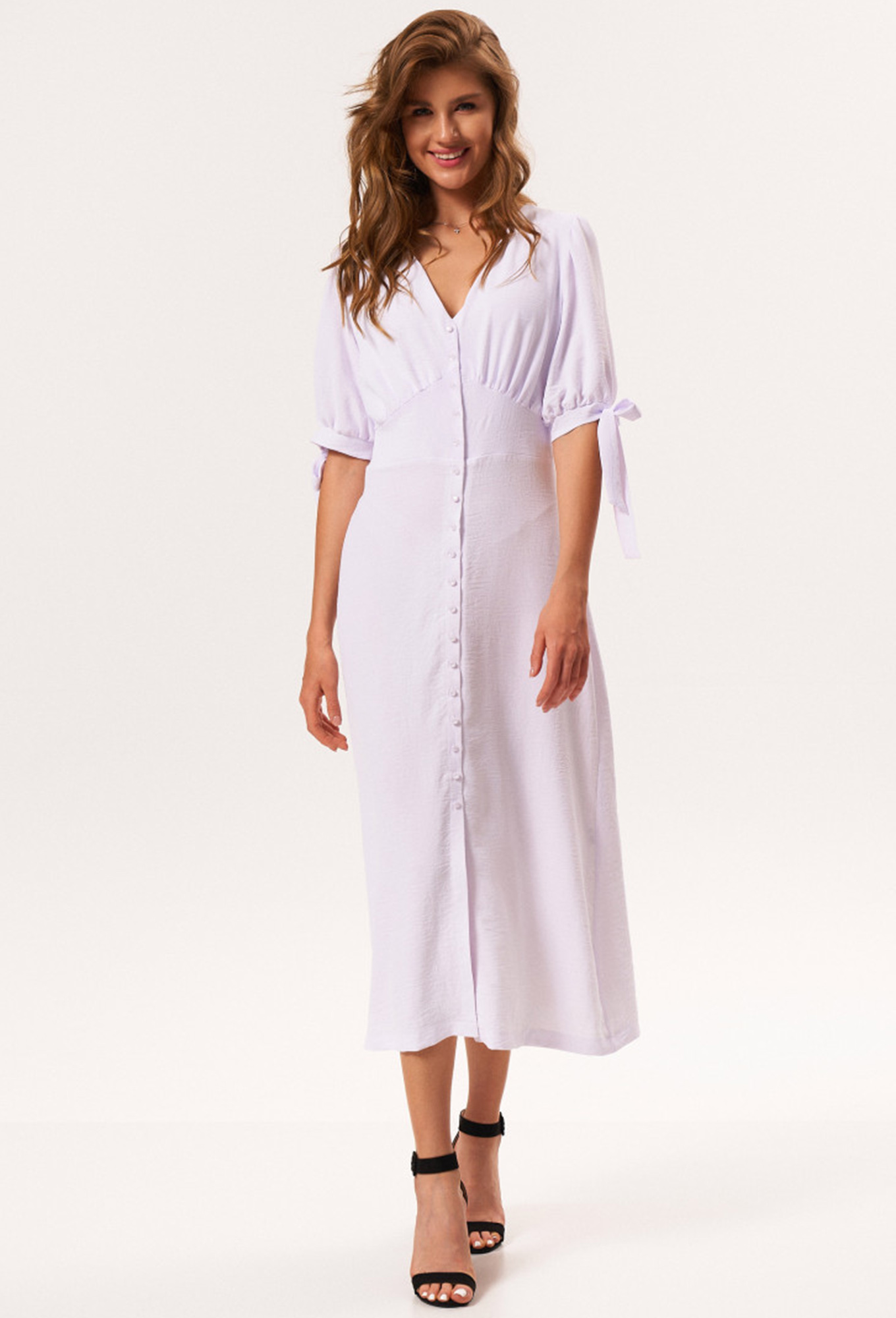 Нежное женское платья прилегающего силуэта, отрезное по линии талии. Перед с фигурной кокеткой и сборкой под грудью. Юбка конической формы длиной ниже линии колена. Вырез горловины глубокий. V-образный. Рукав втачной со сборкой по линии отката и низу. Манжет притачной с завязкой на бант. Платье с застежкой на петли и пуговицы.