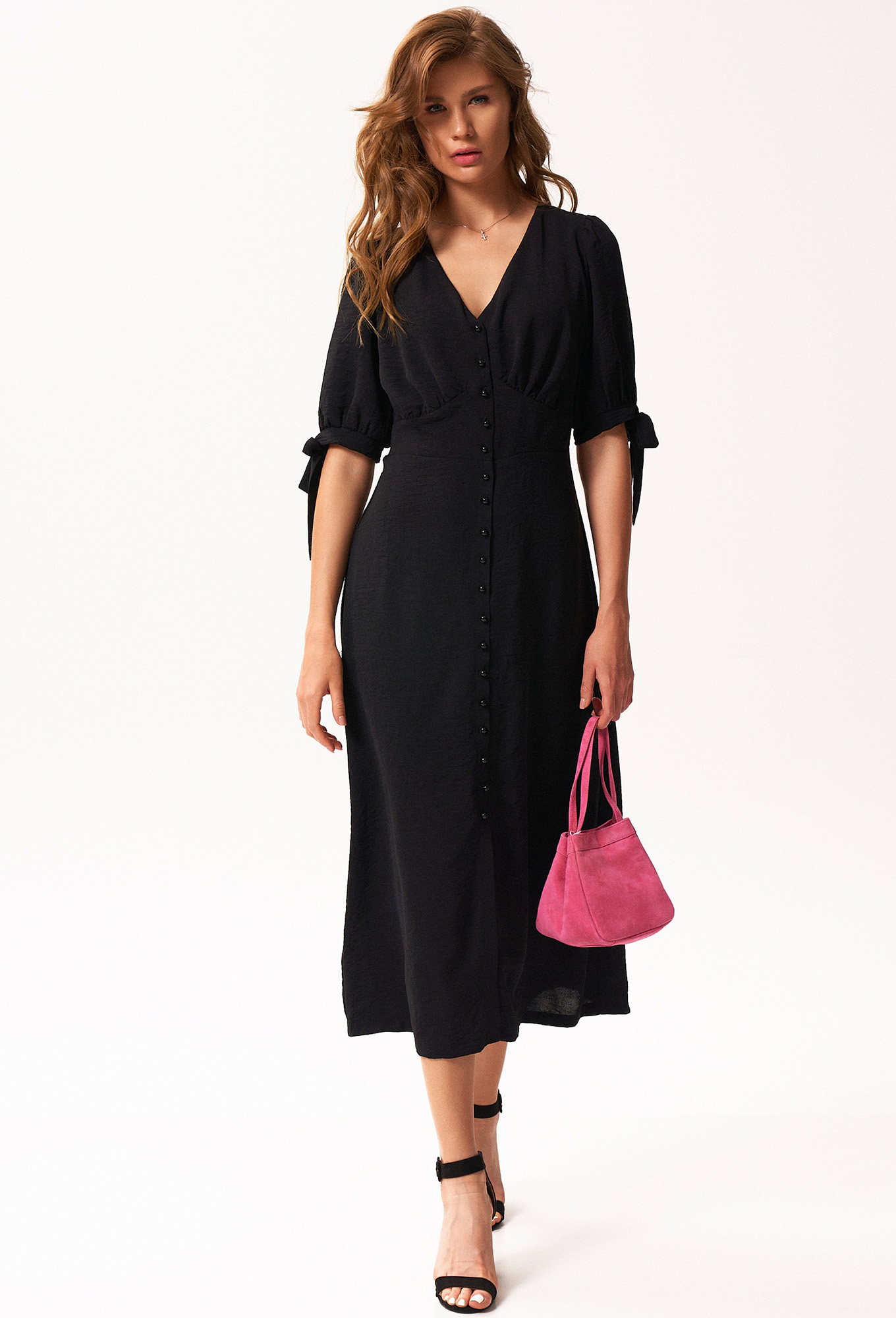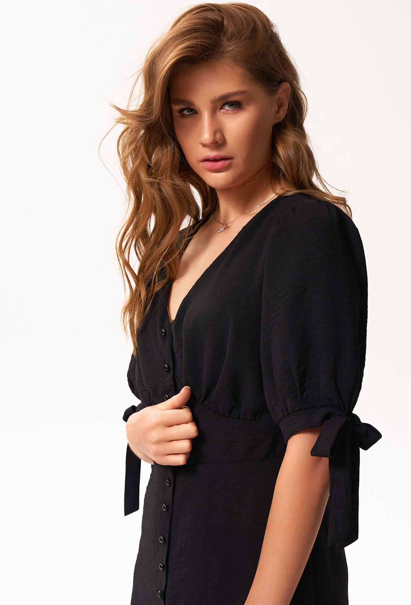 Нежное женское платья прилегающего силуэта, отрезное по линии талии. Перед с фигурной кокеткой и сборкой под грудью. Юбка конической формы длиной ниже линии колена. Вырез горловины глубокий. V-образный. Рукав втачной со сборкой по линии отката и низу. Манжет притачной с завязкой на бант. Платье с застежкой на петли и пуговицы.