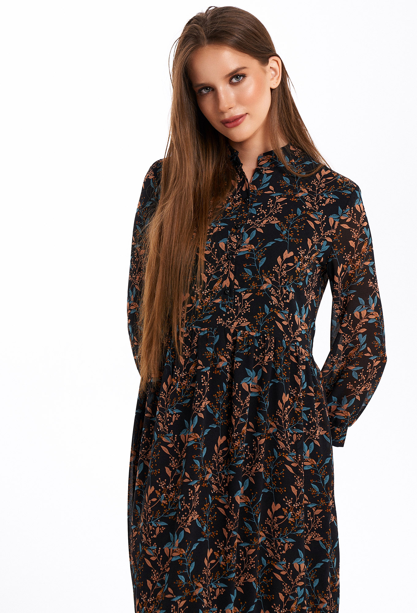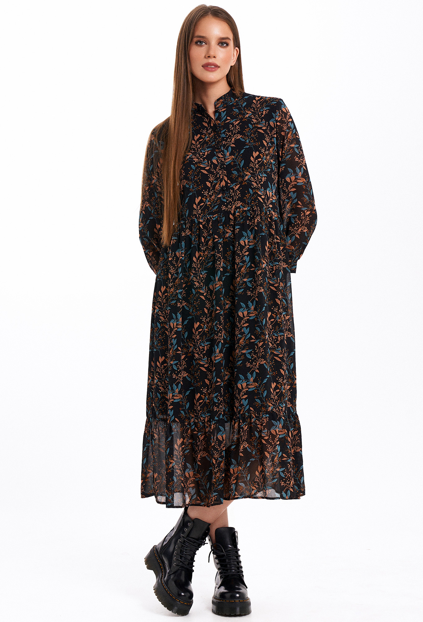 Платье женское свободного силуэта, длиной за линию колена, отрезное по линии талии. Перед лифа с притачной планкой, которая застегивается на петли и пуговицы. Юбка платья имеет два яруса, которые собраны на сборку. Рукав втачной со сборкой по низу и притачной манжетой. Горловина обработана воротником – стойкой. Длина изделия - 127 см