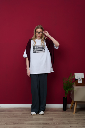 Футболка унисекс в стиле оверсайз из серии "Архитектура", на груди изображен кинотеатр "Эрвий.