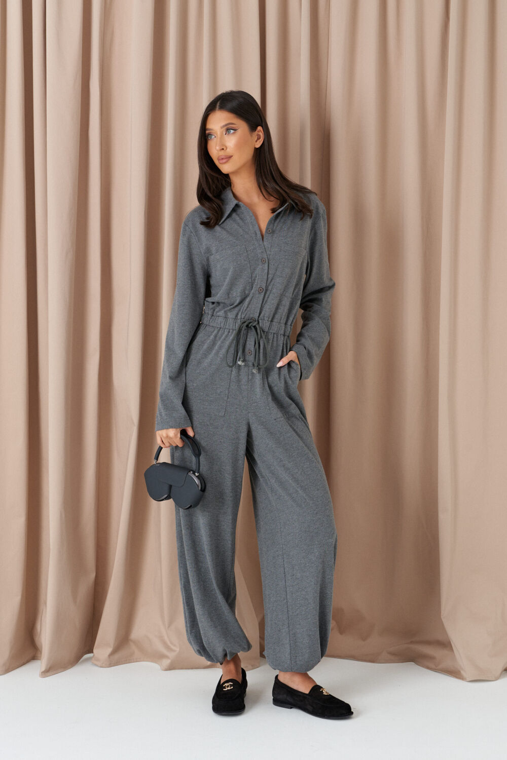 Комбинезон полуприлегающего силуэта выполнен из трикотажа серого цвета. Характеристики: отложной воротник, центральная застежка на петли-пуговицы, талия отрезная на резинке дополнительно на кулиске, на груди и ниже талии расположены карманы, низ брючен на затягивающейся резинке с фиксатором, рукав вточной. Длина изделия от плечевова шва с горловиной 160см, длина рукава от края горловины 75 см.