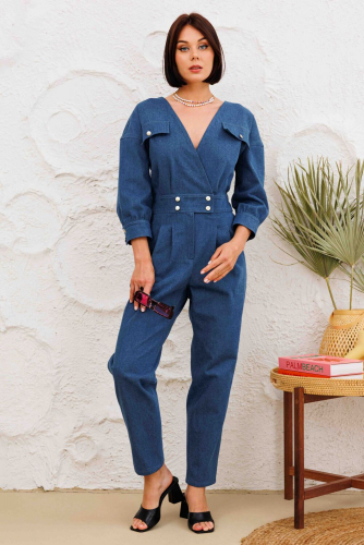 Комбинезон выполнен из денима лиф по переду и спинке имеет v-образный вырез, с обработанными на запах деталями. пояс притачном с застежкой на пуговицы, обработан гульфик с молнией. По передним половинкам брючин в области поясаобработаны застроченные складки. В боковых швах обработаны карманы, по задним пловинкам брючин - накладные карманы. По лифу ткже обработаны клапаны с застежкой на пуговицы. плечевой шов спущен, рукав укорочен, с обработанной манжетой с застежкой на пуговицы