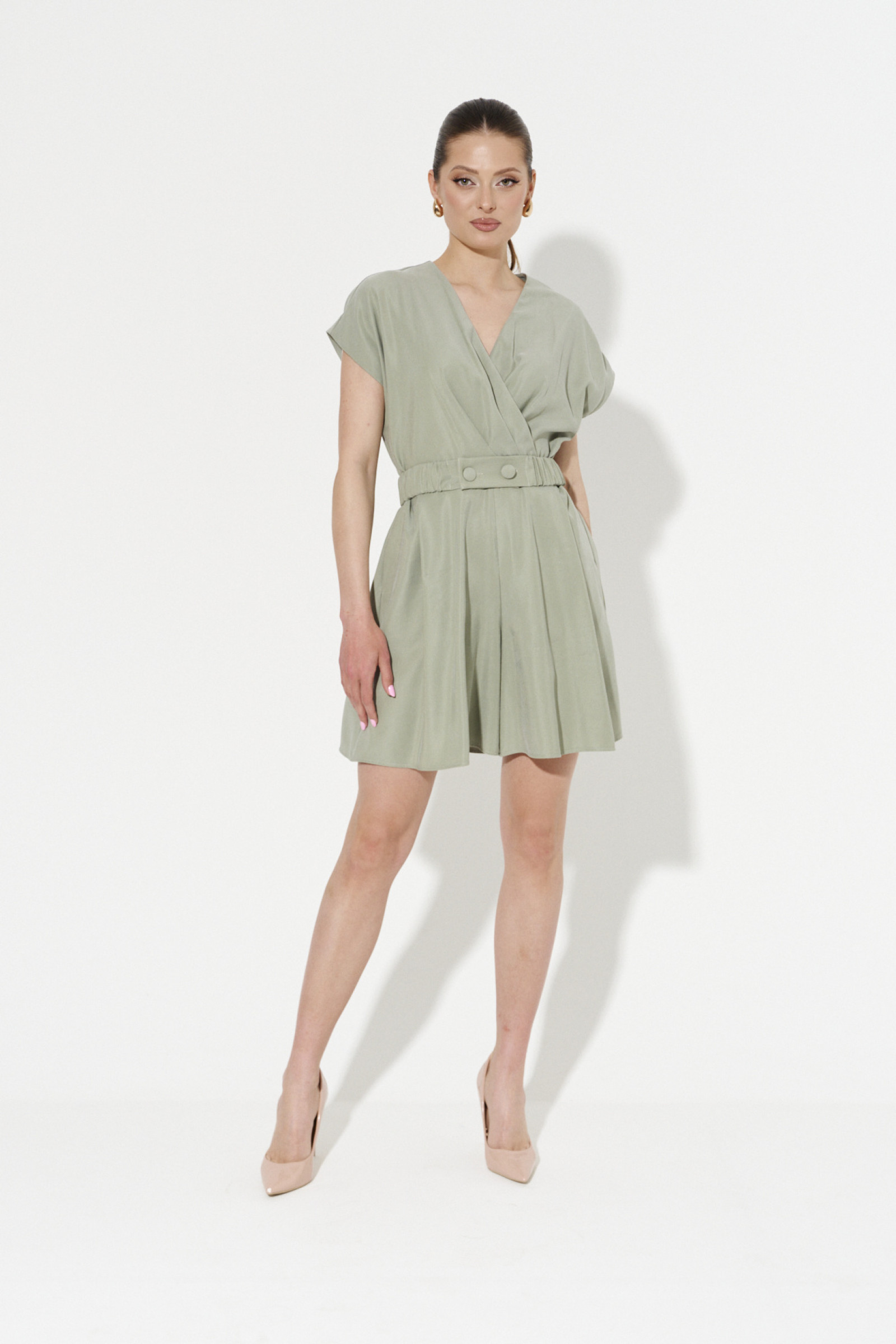 Комбинезон женский из вискозной ткани для повседневной носки. Без подкладки. Комбинезон с коротким цельнокроеным рукавом, V-образной горловиной. На передней части комбинезона имитация запаха. В боковых швах прорезные карманы. Застежка на потайную молнию в среднем шве спинки.
