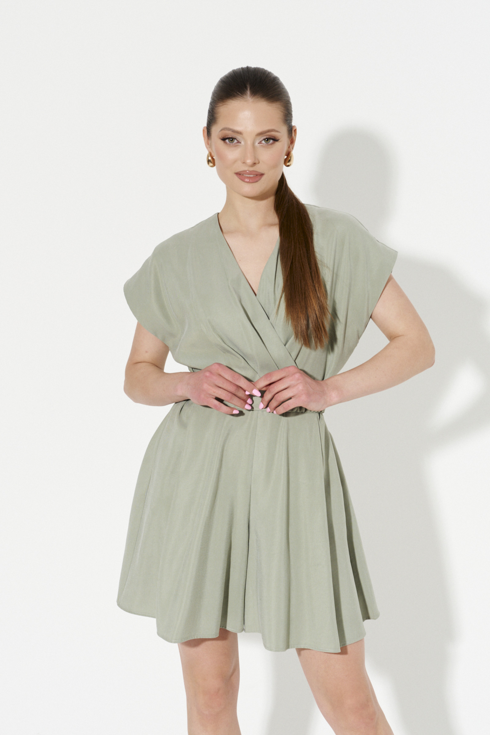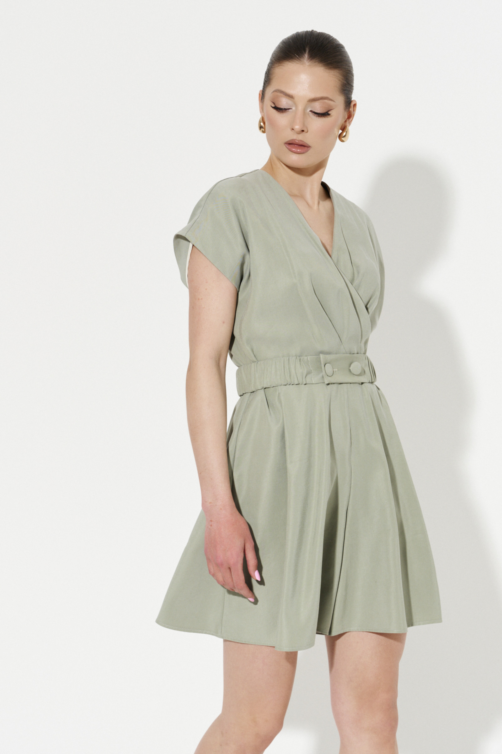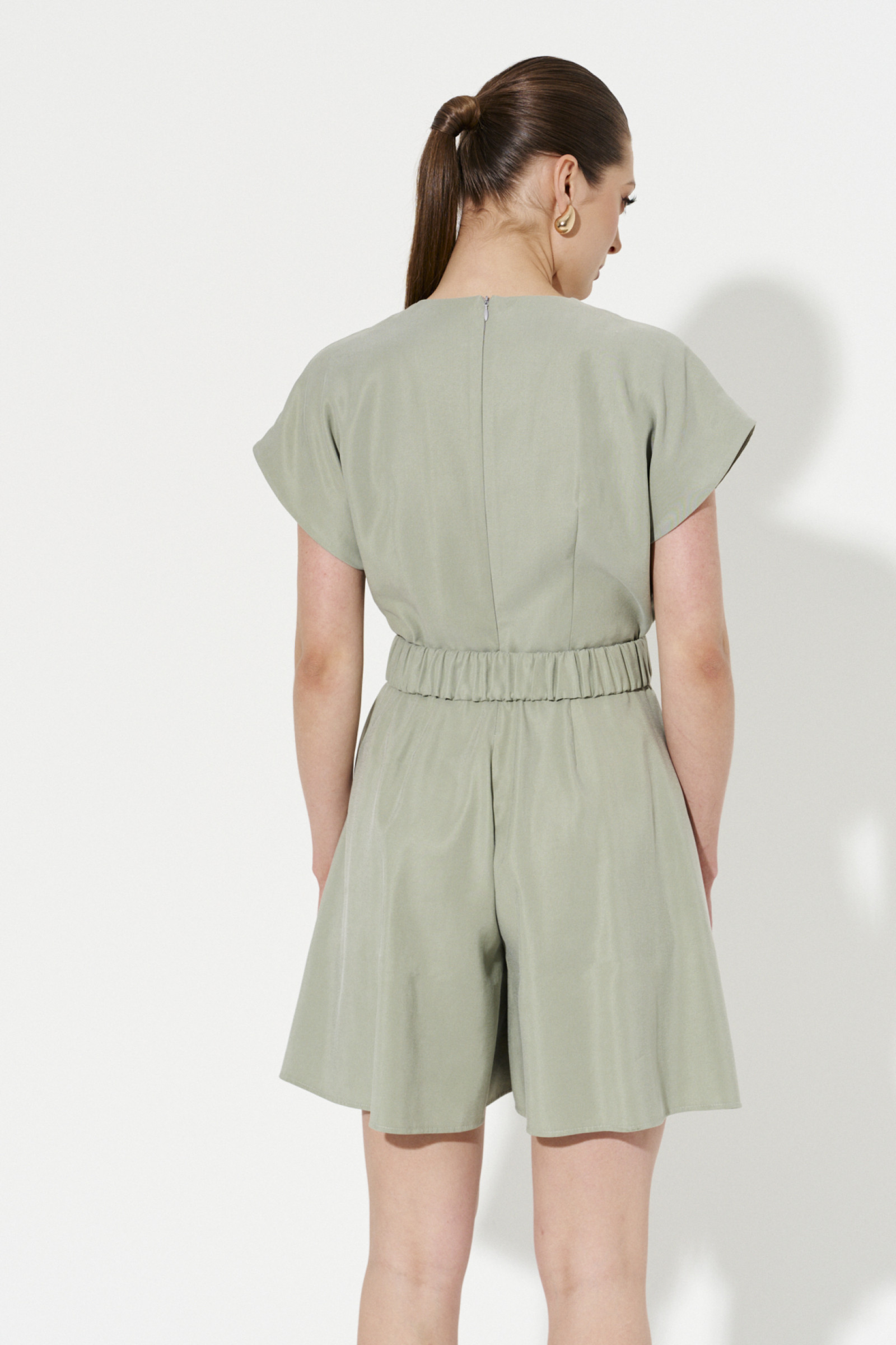 Комбинезон женский из вискозной ткани для повседневной носки. Без подкладки. Комбинезон с коротким цельнокроеным рукавом, V-образной горловиной. На передней части комбинезона имитация запаха. В боковых швах прорезные карманы. Застежка на потайную молнию в среднем шве спинки.
