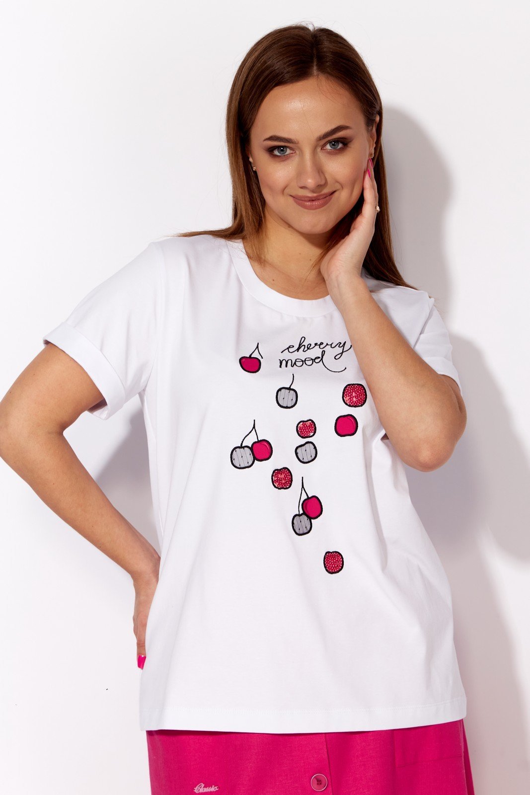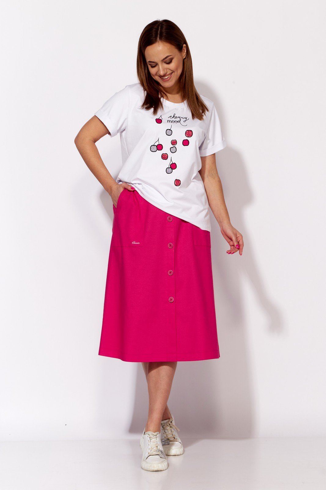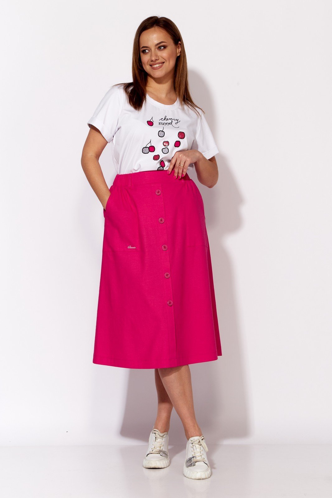Комплект женский, 2х предметный, состоящий из футболки и юбки. Футболка прямого силуэта с коротким рукавом, по низу с отворотом. Вырез горловины круглой формы с подрезной бейкой. Перед задекорирован вышивкой. Юбка типа- колокол. По центру переда отлетная планка, зафиксированная пуговицами. Карманы накладные с отделочной нашивкой. Пояс притачной , частично на резинке. Центральная часть пояса без резинки. юбка без подкладки.