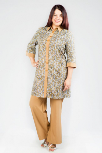 бирюзовый Повседневный комплект из брюк и свободной блузы рубашечного типа. Блуза с центральной застежкой на петли и пуговицы из легкого дышащего материала, с разрезами по боковым швам. Воротник отложной на стойке. Втачные рукава длиной за локоть с манжетой по нижнему срезу. Брюки прямого силуэта из легкой костюмной ткани с хорошей посадкой. Модель с центральной застежкой на комбинированном поясе с эластичной лентой на уровне бокового шва.