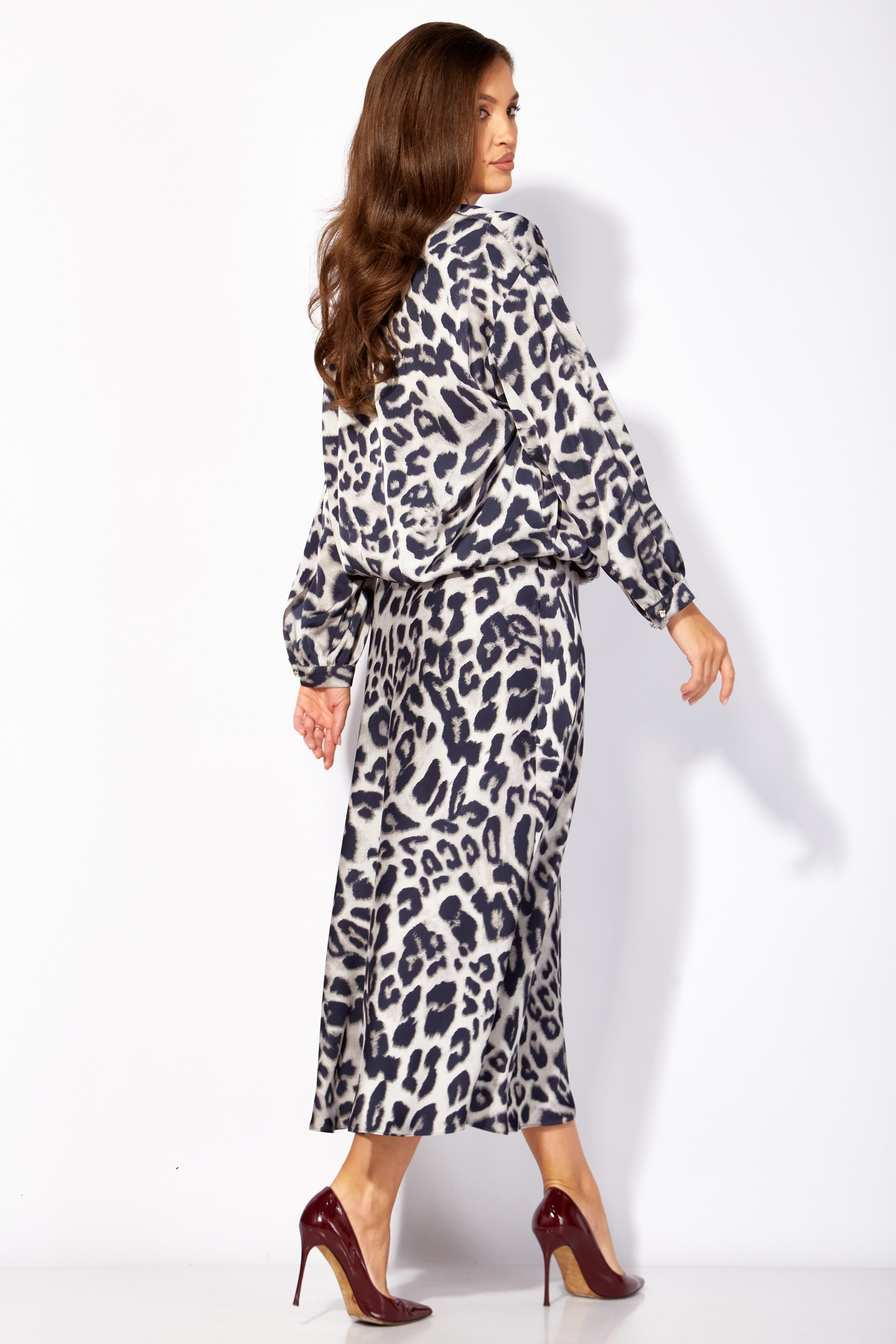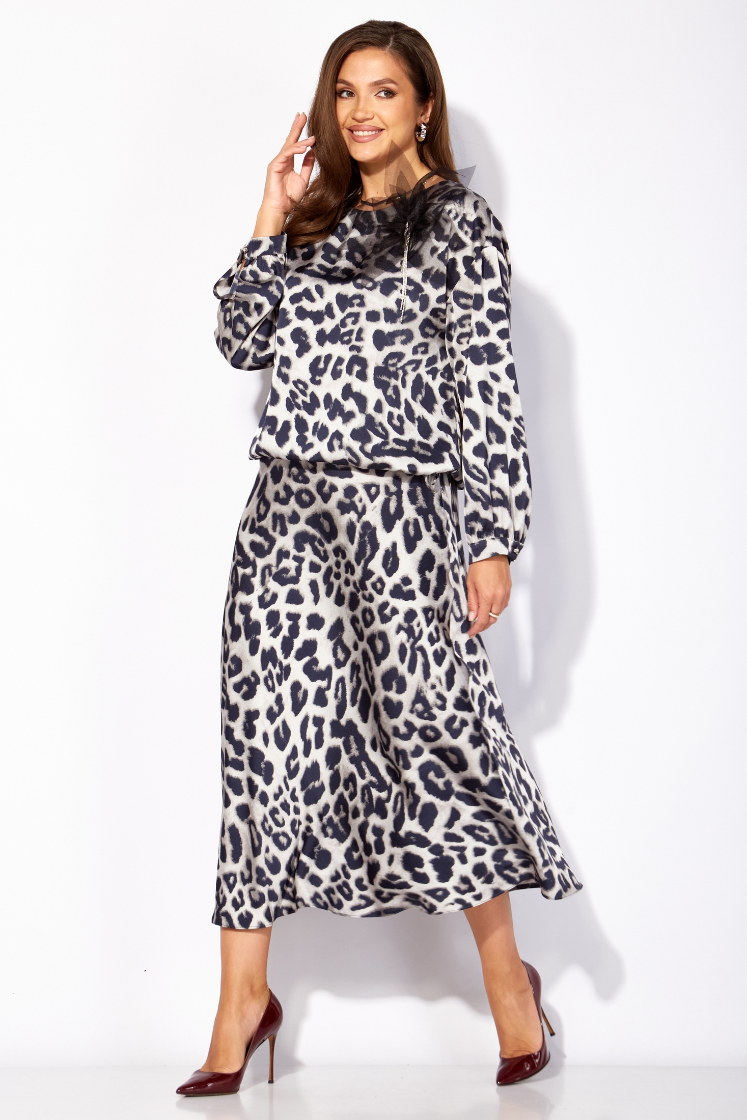 Костюм женский, 2 х предметный, состоит из блузки и юбки. Блузка свободного силуэта, по низу на регулируемой кулисе. Рукав длинный, со спущенной линией плеча. По низу рукава манжета с застёжкой на две кнопки (возможность регулировки ширины манжеты). Вырез горловины круглой формы. По спинке овальной формы разрез и застёжка на навесную петлю и пуговицу. Юбка расширенная к низу, крой ,, по косой". Верх юбки на обтачке . Застёжка сбоку на потайную тесьму "молния". Декором костюма служит съёмный цветок .