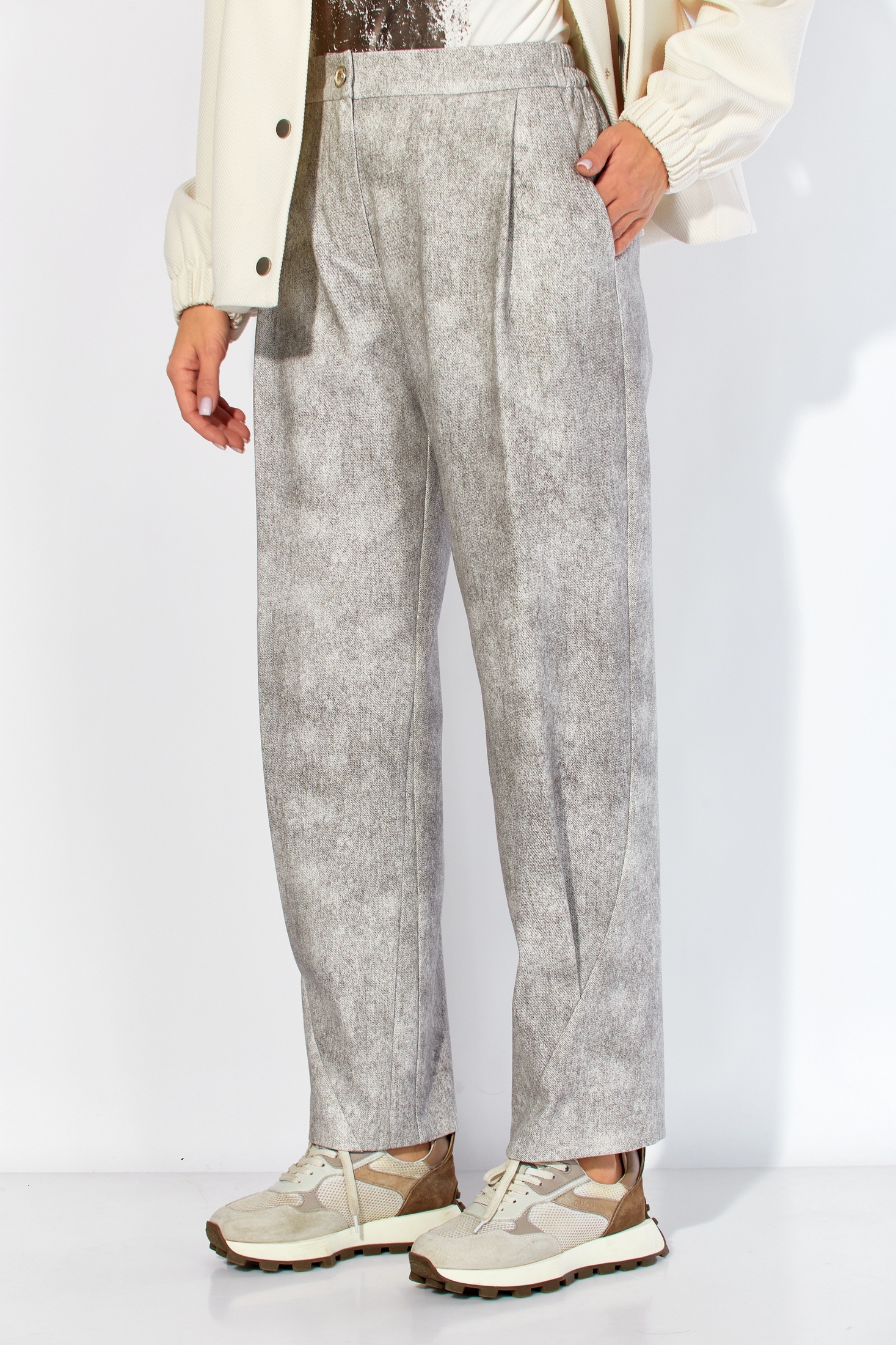 Женственный комплект из бомбера и брюк, выполненный в белых и серых тонах. Бомбер прямого силуэта с мягкими складками и центральной застежкой на кнопки дополняется карманами с отделкой. Брюки типа "бананов" придают образу дерзости и комфорта, благодаря резинке на поясе и застежке на молнию. Изготовленные из полиэстера и вискозы, костюм идеально подойдет для весеннего и осеннего периода. Этот комплект станет отличным дополнением как для повседневных прогулок, так и для более формальных мероприятий.