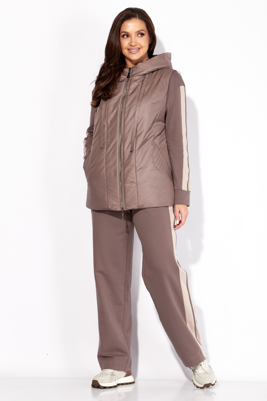 Свитшот прямого силуэта с отрезными бочками. Рукав длинный, со спущенной линией плеча, снизу на манжете. Горловина круглой формы с подрезной бейкой. Перед задекорирован принтом. Брюки прямые с карманами в боковых швах. По низу небольшой разрез. Пояс притачной с резинкой (по центру гладкий). По бокам брюк и по центру рукавов втачные отделочные лампасы с контрастным кантом. Жилет выполнен из плащевки на синтепоне (vs100) на подкладке, прямого силуэта. По переду рельефы из пройм в боковой шов. В рельефах карманы с отделочными деталями в форме клапана. Застежка центральная на тесьму-молния. Горловина оформлена капюшоном со стойкой и кулисой. По спинке фигурные рельефы. Центральная часть с отделочной деталью и декоративной нашивкой. Низ жилета по спинке чуть длиннее.