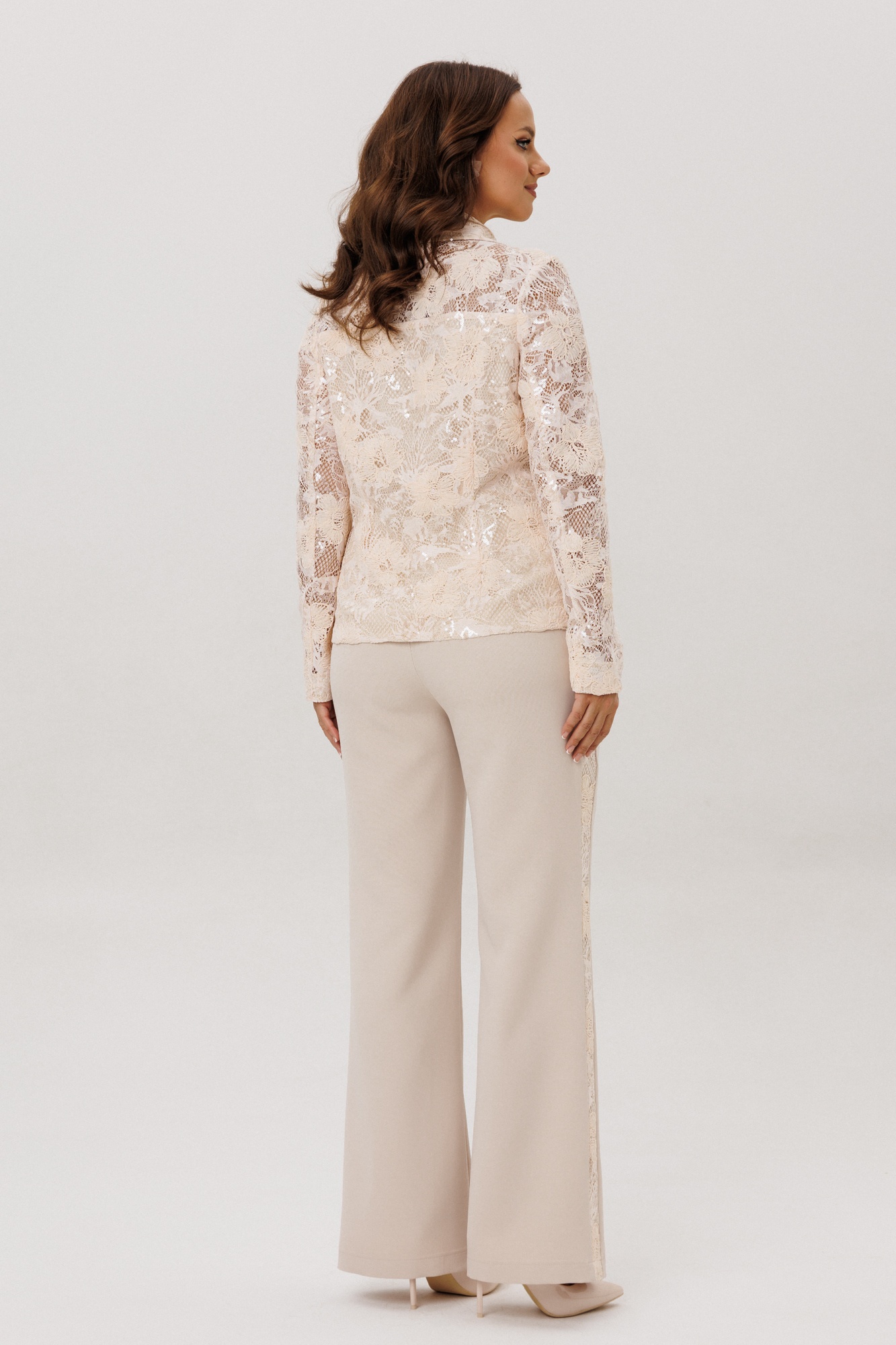 Костюм брючный 300 экрю Мублиз – это изысканный выбор, сочетающий в себе стиль и удобство. Коллекция бренда Мублиз предлагает нарядный костюм, который выполнен из комбинации тянущейся костюмной ткани и гипюра с вышивкой и пайетками. Этот женский комплект включает полуприлегающий жакет с лацканом и двумя карманами, а также брюки с высокой посадкой и молнией по боковому шву. Лампасы из гипюра добавляют особый акцент, делая костюм идеальным для деловых и торжественных мероприятий в любое время года. Его стиль и детализация обеспечивают комфорт и привлекательность благодаря современным материалам и дизайну.