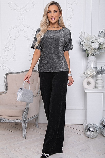 Комплект из блузки и брюк.Блузка из трикотажного полотна с блеском с цельнокроеными рукавами.Брюки  из трикотажного полотна расширенные к низу, с эластичной резиной в поясе.