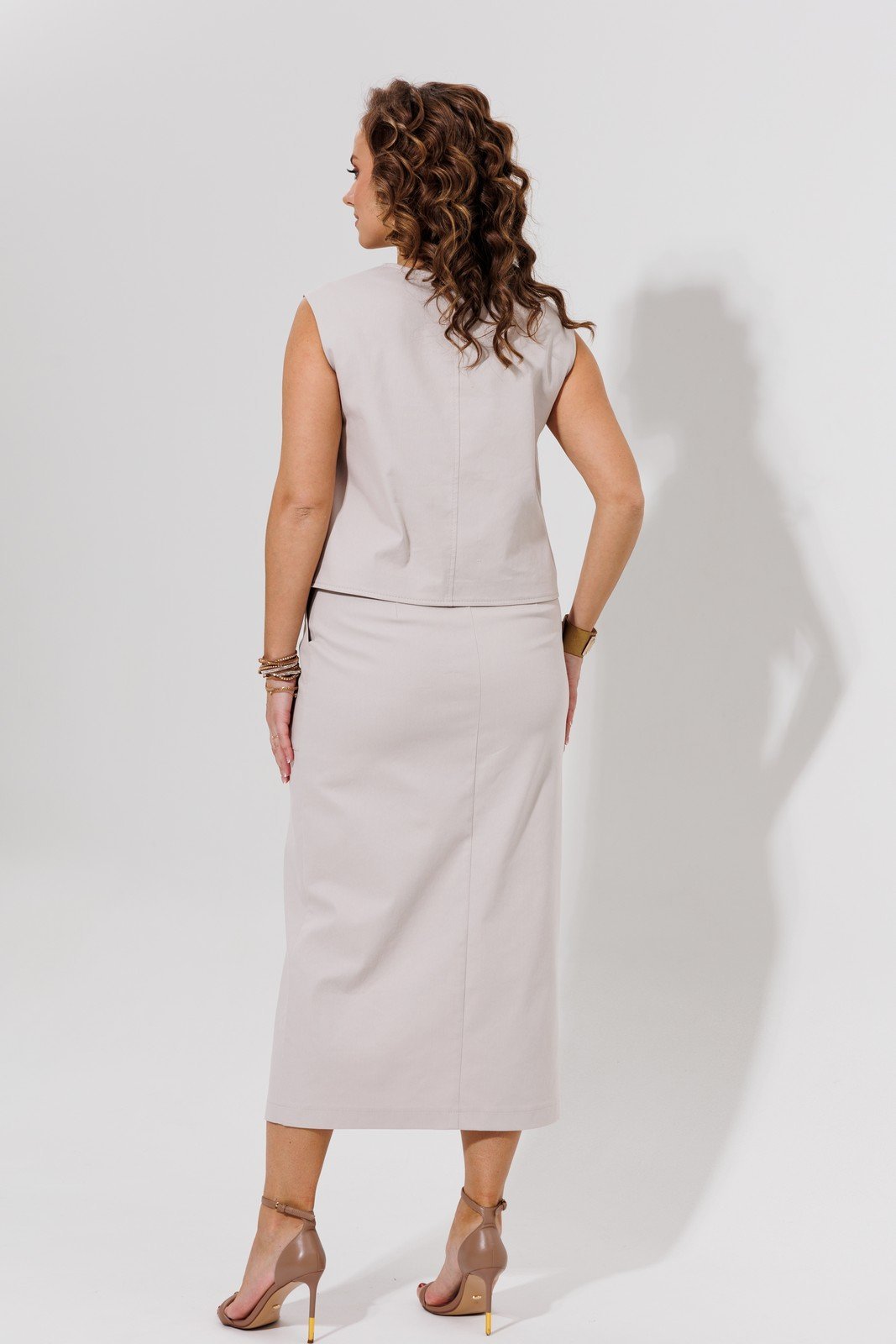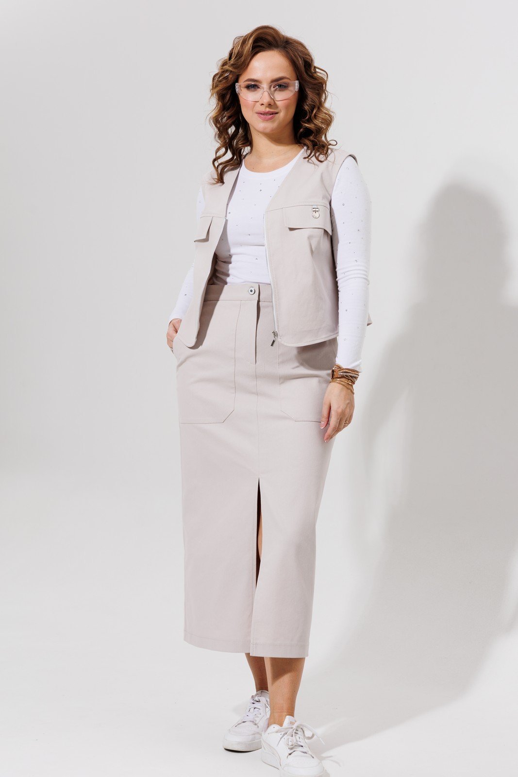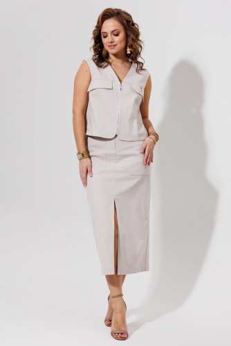 Костюм выполнен из текстильной ткани с добавлением хлопка, что обеспечивает приятные тактильные ощущения и комфорт в носке. Жилетка прямого силуэта со спущенной линией плеча и декоративным клапаном на репсовой тесьме подчеркивает современный стиль. Юбка средней длины с накладными карманами и разрезом спереди создает женственный образ. Бежевый цвет отлично подходит для повседневного или офисного стиля, делая костюм универсальным для любого сезона.