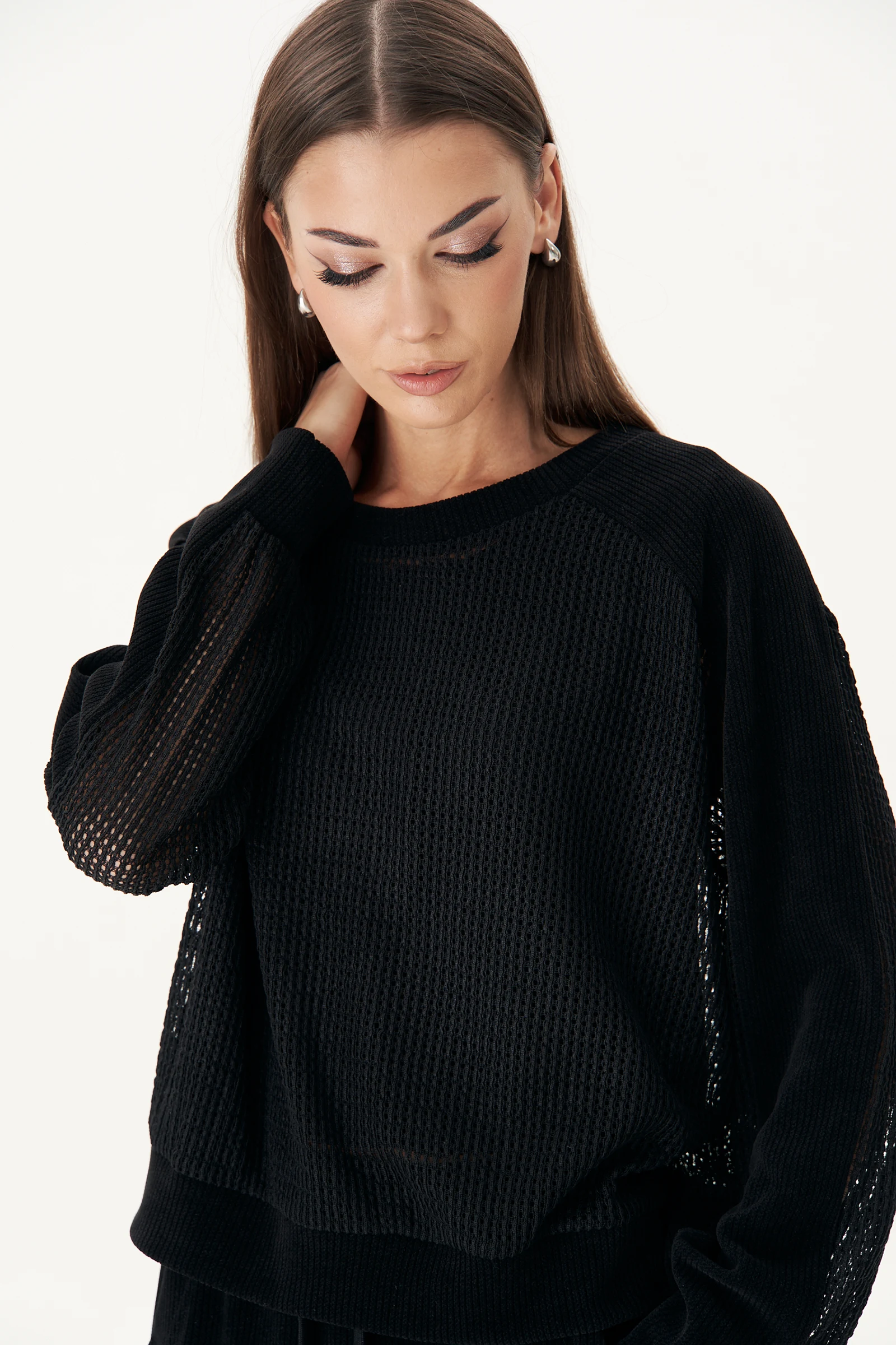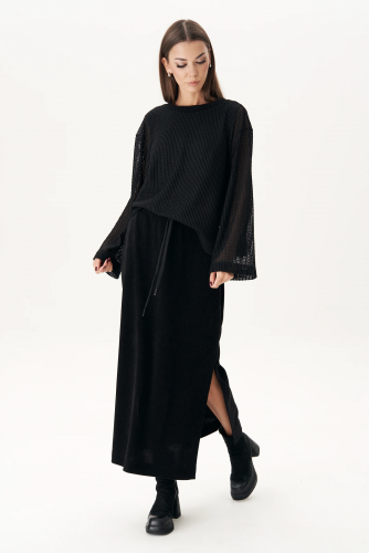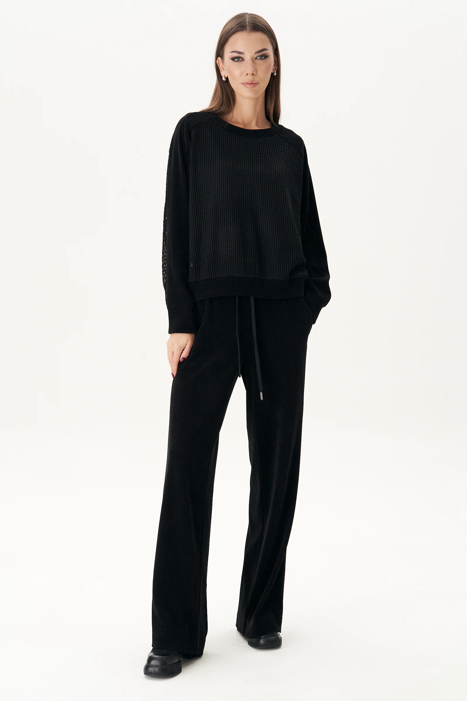 Тренд на готовый костюм с брюками - идеальное решение для тех, кто не хочет отказываться от мягкости и уюта трикотажного полотна, а также сохраняет своё время. Такой комплект создаёт максимально тёплый, элегантный и одновременно стильный образ. Брюки свободные, в расслабленном стиле, на притачном эластичном поясе с люверсами и отделочным шнуром-кулисой. По боковым швам - наклонные карманы. Джемпер свободный, из трикотажной фактурной сетки с металлическим напылением и отделкой из текстурного трикотажа. Покрой свободный с заниженной линией плеча. Рукав с отрезной манжетой и цельнокроеным лампасом, переходящим на полочку и спинку. Манжеты, отрезной пояс низа джемпера и обтачка горловины также из отделочного трикотажа. Современный и стильный кроп-топ подчеркнет вашу модную натуру, создавая актуальный образ. Декоративная строчка добавляет изысканности и оригинальности, делая его уникальным. Длина джемпера около 62 см. Длина рукава с плечом около 74 см.