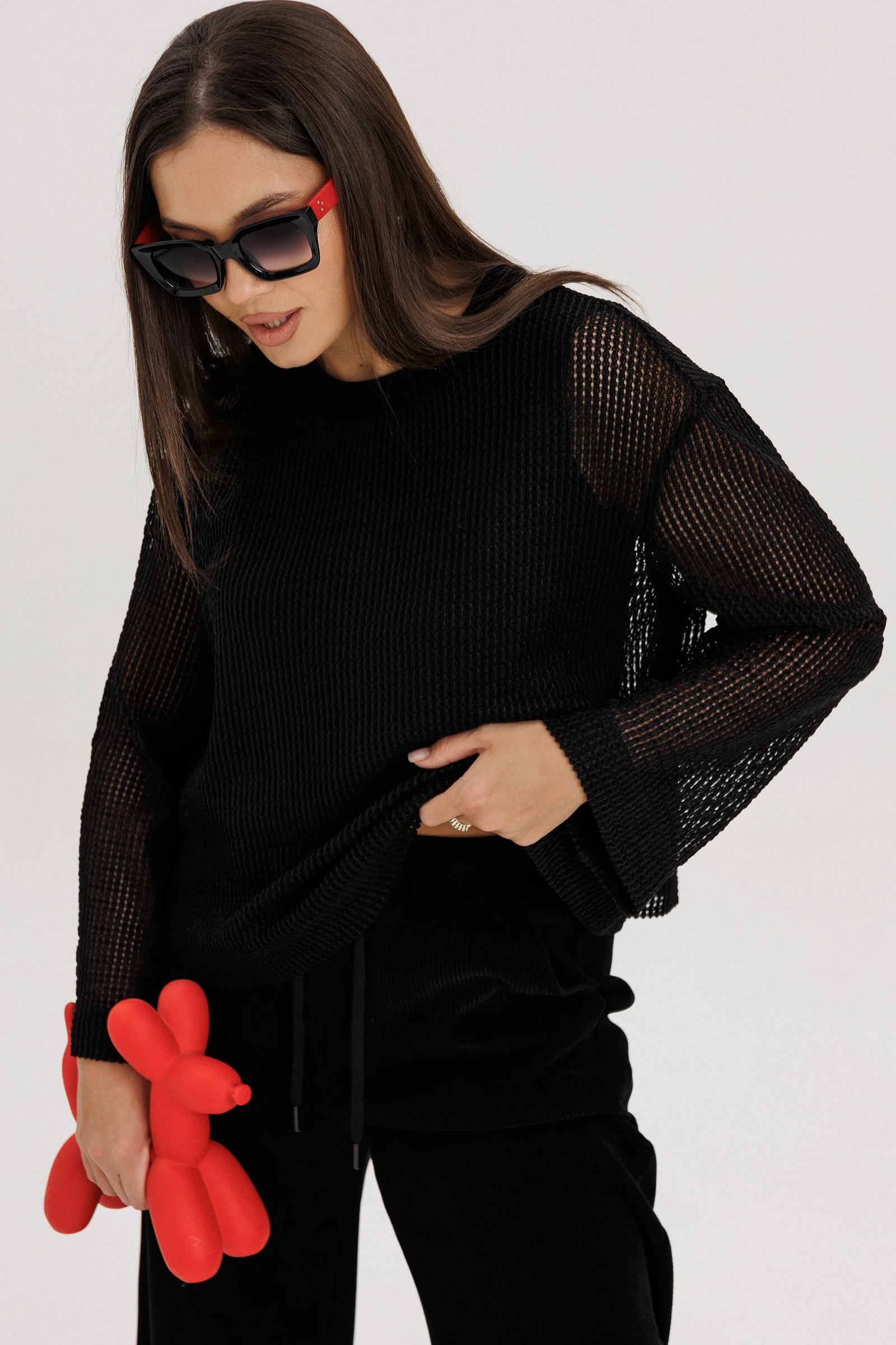джемпер 20% хлопок, 80% ПЭ. Брюки 90% ПЭ, 6% вискоза, 4% спандекс. Топ: хлопок 95%, спандекс 5%