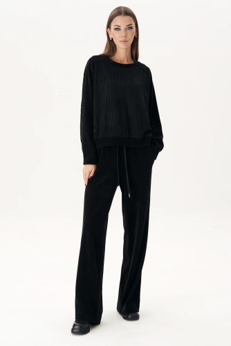Тренд на готовый костюм с брюками - идеальное решение для тех, кто не хочет отказываться от мягкости и уюта трикотажного полотна, а также сохраняет своё время. Такой комплект создаёт максимально тёплый, элегантный и одновременно стильный образ. Брюки свободные, в расслабленном стиле, на притачном эластичном поясе с люверсами и отделочным шнуром-кулисой. По боковым швам - наклонные карманы. Джемпер свободного силуэта, покроя с заниженной линией плеча. Рукав слегка расширенный к низу. Обтачка горловины из отделочного текстурного трикотажа. Современный и стильный кроп-топ подчеркнет вашу модную натуру, создавая актуальный образ. Декоративная строчка добавляет изысканности и оригинальности, делая его уникальным. Длина джемпера около 60 см. Длина рукава с плечом около 76 см.