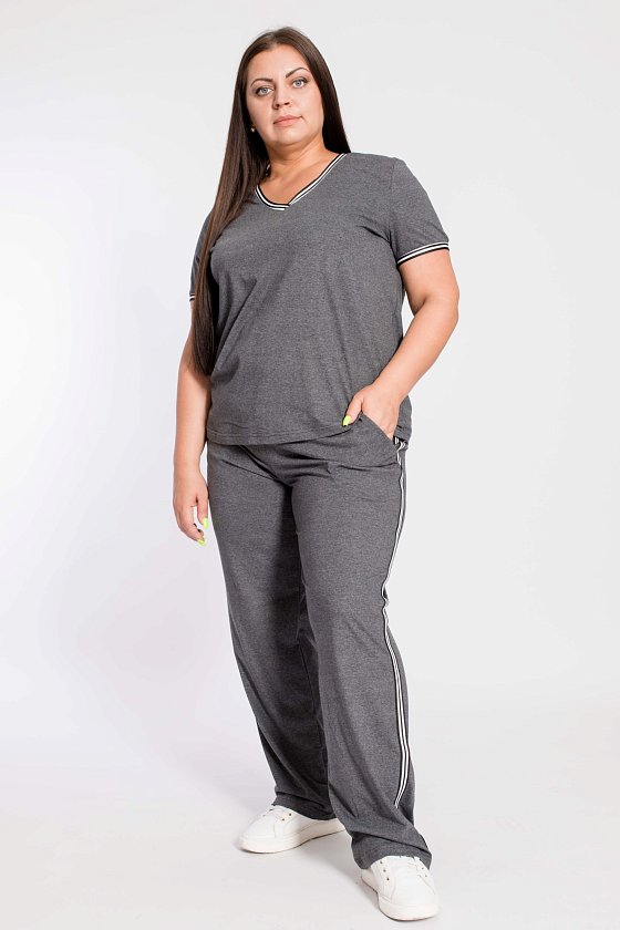 Комплект выполнен из кулирки, 100% хлопок. Футболка с V-образным вырезом горловины и коротким рукавом. Брюки с боковыми карманами и притачным поясом на резине. На футболке и брюках в качестве отделки использована лампасная тесьма.