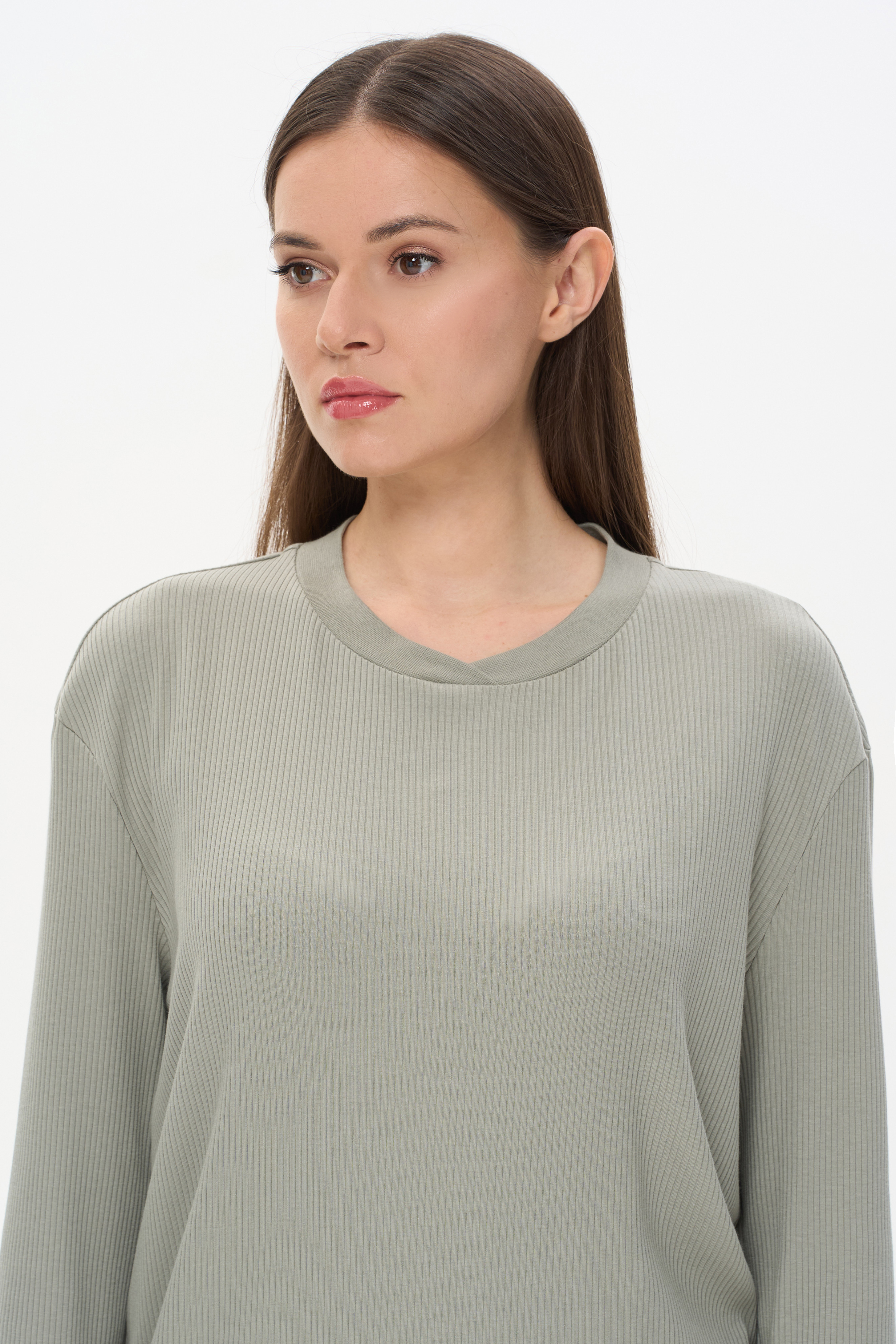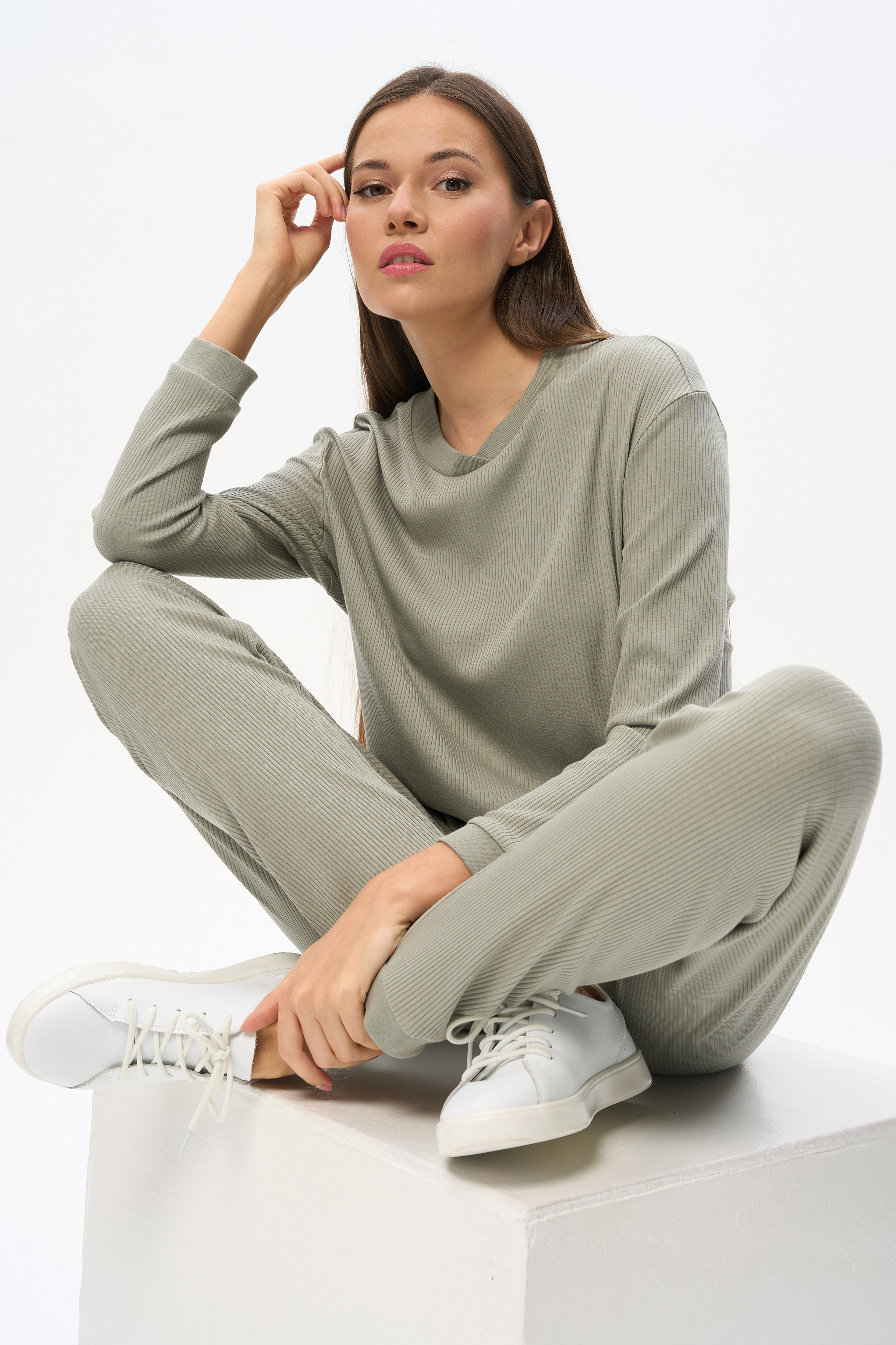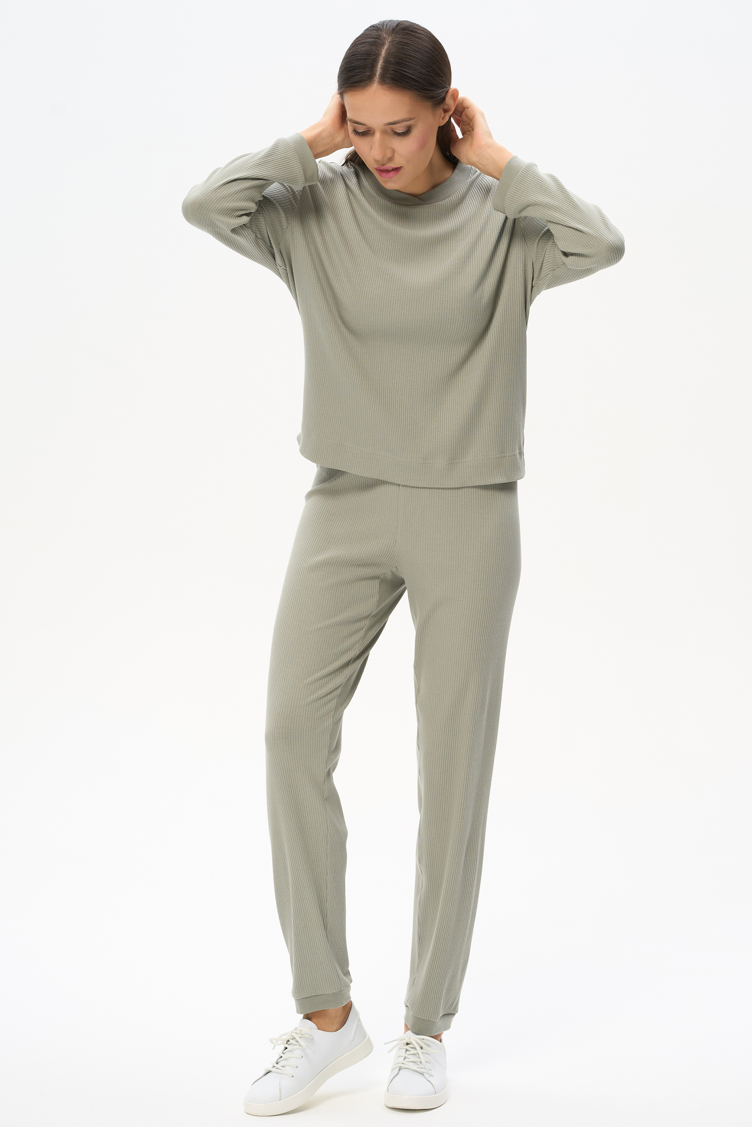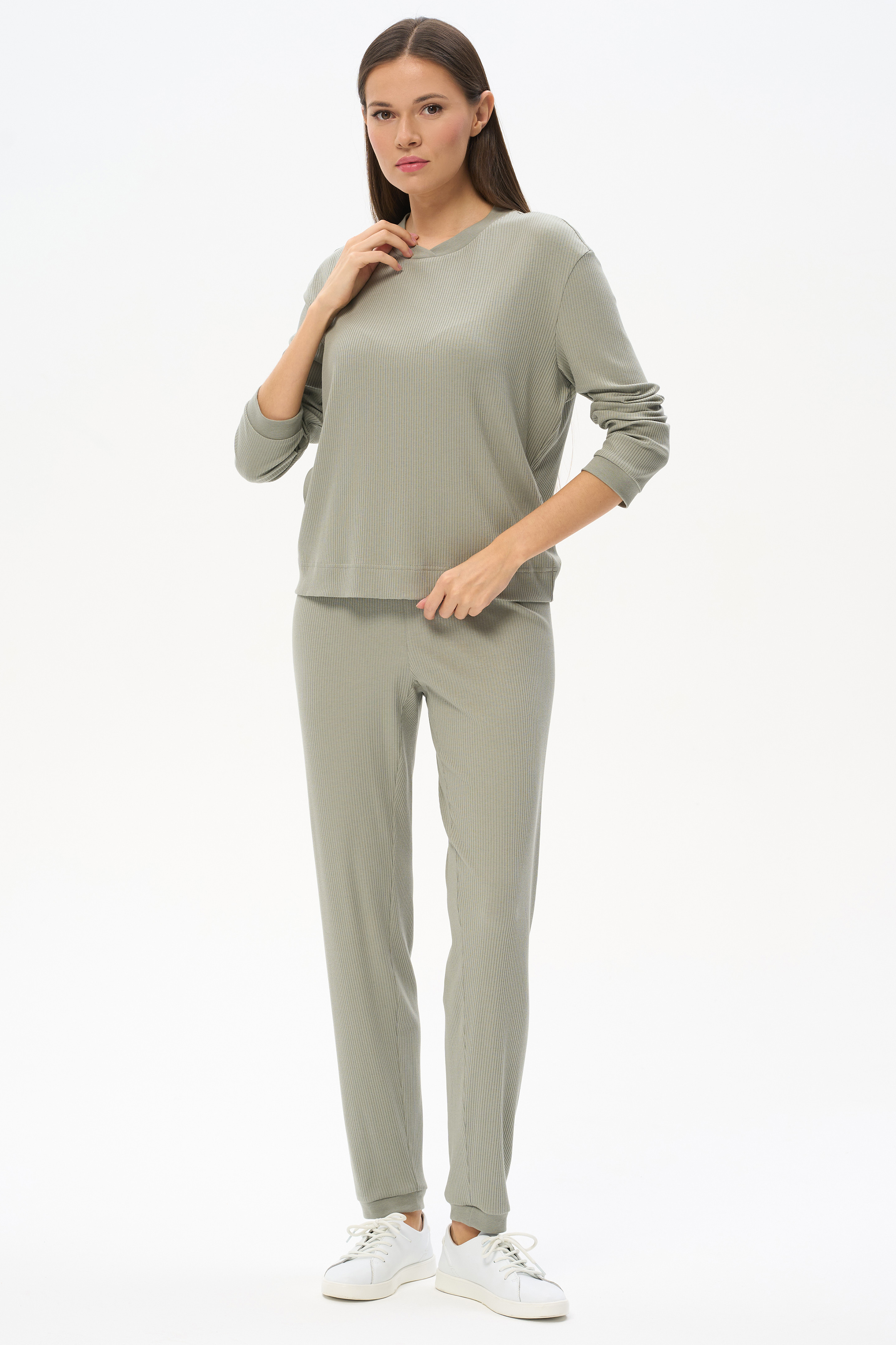 49% хлопок, 49% модал, 2% эластан Комплект с брюками из фактурного хлопкового полотна с модалом 200 гр.в оттенке Полынь. Джемпер свободного силуэта, круглый вырез горловины, длинные втачные рукава с манжетами. Вырез горловины и манжеты из рибаны. Брюки без бокового шва, цельнокроеный пояс с эластичной лентой внутри, по низу мягкая резинка. Прекрасный комплект для отдыха. Длина брюк в 44р - 97 см. Рост модели 175 см.