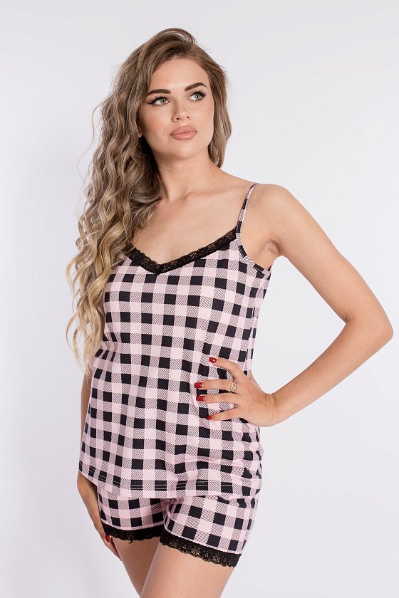 Комплект выполнен из кулирки, состоит из шорт и топа на тонких бретелях. Шорты с боковыми карманами и поясом на резине, украшенным атласной лентой. Отделкой является нежное кружево, расположенное на горловине топа и по низу шорт.