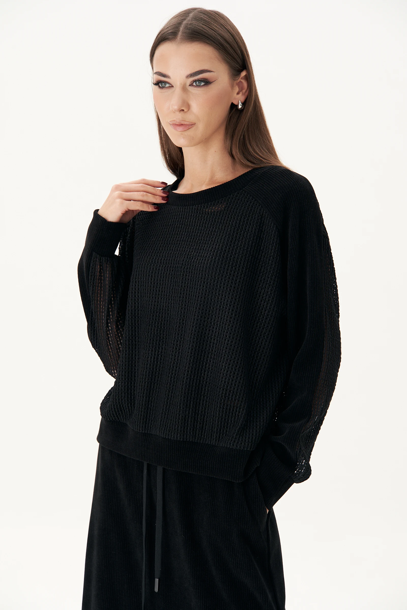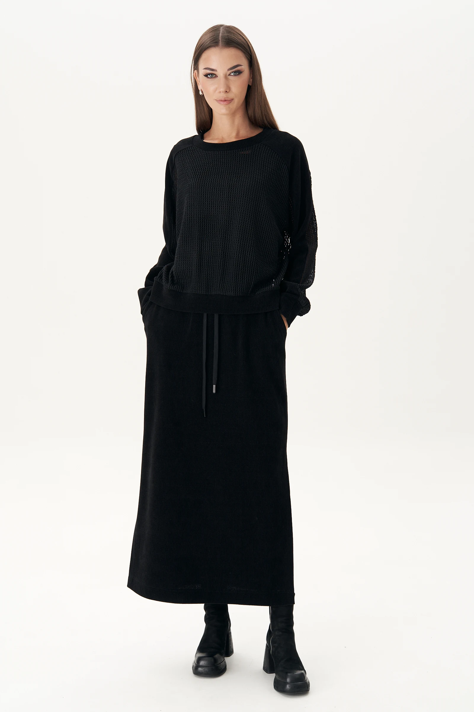 Тренд на готовый костюм с юбкой - идеальное решение для тех, кто не хочет отказываться от мягкости и уюта трикотажного полотна, а также сохраняет своё время. Такой комплект создаёт максимально тёплый, элегантный и одновременно стильный образ. Юбка макси, прямая на притачном эластичном поясе с люверсами и отделочным шнуром в кулисе, наклонными боковыми карманами и разрезом сбоку, из текстильного трикотажного полотна эффекта вельвет. Джемпер свободный, из трикотажной фактурной сетки с металлическим напылением и отделкой из текстурного трикотажа. Покрой свободный с заниженной линией плеча. Рукав с отрезной манжетой и цельнокроеным лампасом, переходящим на полочку и спинку. Манжеты, отрезной пояс низа джемпера и обтачка горловины также из отделочного трикотажа. Современный и стильный кроп-топ подчеркнет вашу модную натуру, создавая актуальный образ. Декоративная строчка добавляет изысканности и оригинальности, делая его уникальным. Длина юбки около 90 см. Длина джемпера около 62 см. Длина рукава с плечом около 74 см.