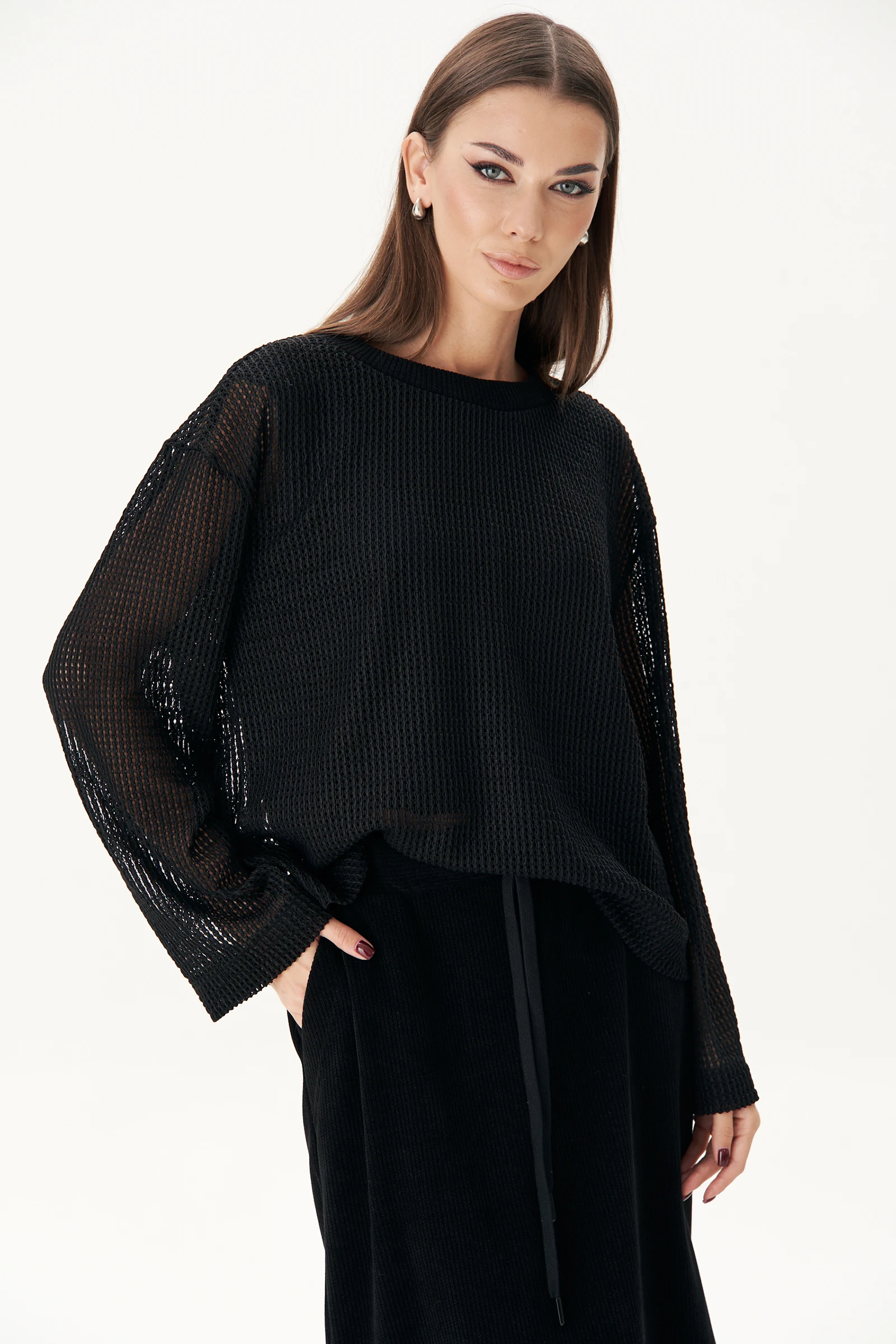 Тренд на готовый костюм с юбкой - идеальное решение для тех, кто не хочет отказываться от мягкости и уюта трикотажного полотна, а также сохраняет своё время. Такой комплект создаёт максимально тёплый, элегантный и одновременно стильный образ. Юбка макси, прямая на притачном эластичном поясе с люверсами и отделочным шнуром в кулисе, наклонными боковыми карманами и разрезом сбоку, из текстильного трикотажного полотна эффекта вельвет. Джемпер свободного силуэта, покроя с заниженной линией плеча. Рукав слегка расширенный к низу. Обтачка горловины из отделочного текстурного трикотажа. Современный и стильный кроп-топ подчеркнет вашу модную натуру, создавая актуальный образ. Декоративная строчка добавляет изысканности и оригинальности, делая его уникальным. Длина джемпера около 60 см. Длина рукава с плечом около 76 см. Длина юбки около 90 см.