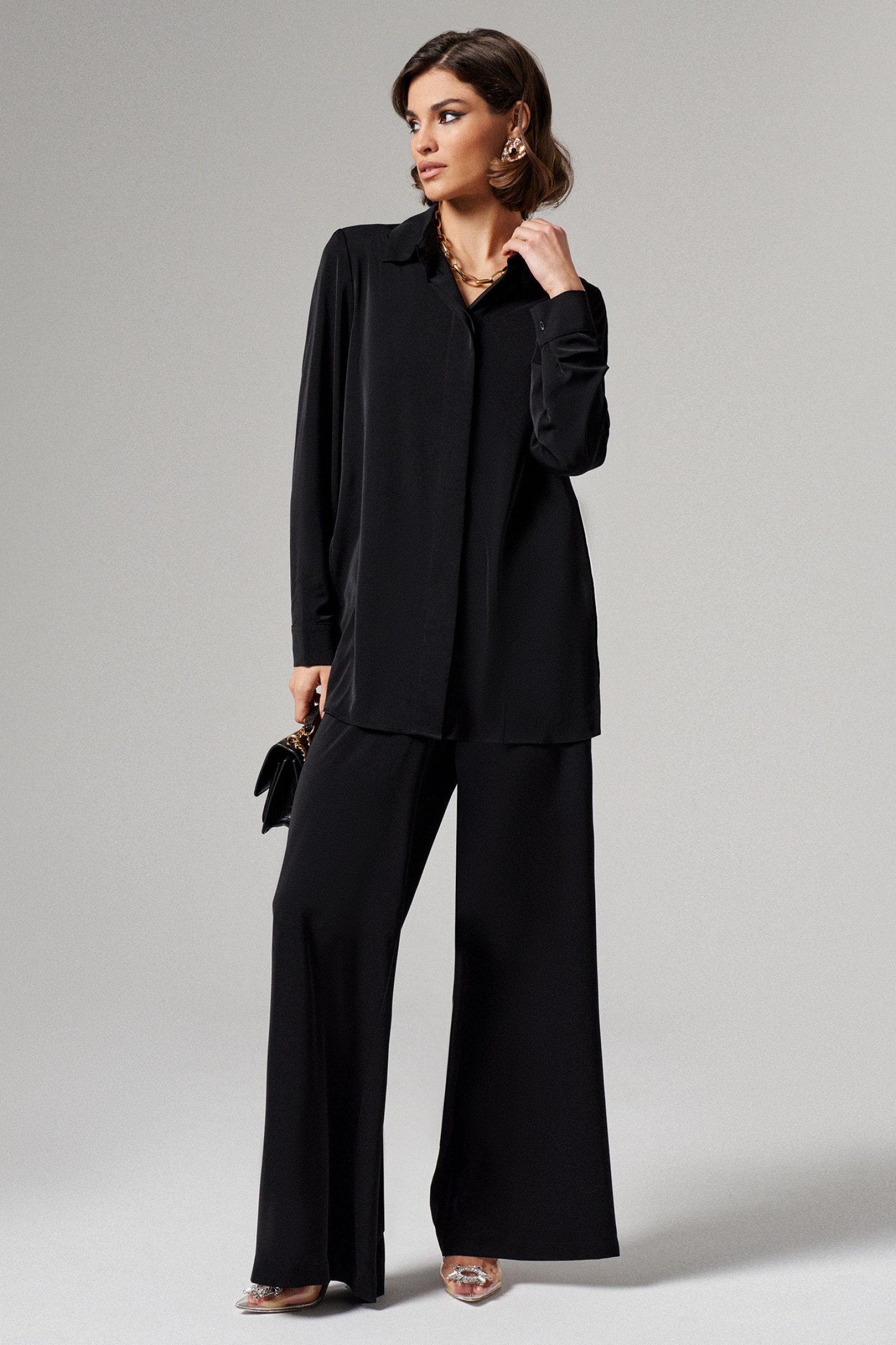 46 Блузка: Длина изделия - 77см, Длина рукава - 61см, Обхват шеи - 45см, Ширина плеча - 13см, Ширина по груди - 54см, Ширина по низу - 60см, Ширина рукава - 19см; Брюки: Высота посадки - 32см, Длина брюк с поясом - 114см, Длина по внутреннему шву - 84см, Ширина брючин сверху - 74см, Обхват брюк по низу - 63см, Ширина по бедрам - 56см, Ширина по талии - 39см;