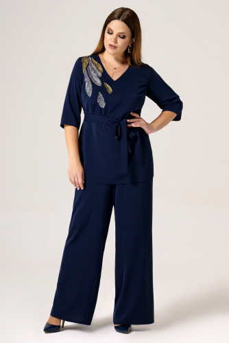 50 Блузка: Длина изделия - 77см, Длина рукава - 61см, Обхват шеи - 46см, Ширина плеча - 13см, Ширина по груди - 58см, Ширина по низу - 64см, Ширина рукава - 20см; Брюки: Высота посадки - 33см, Длина брюк с поясом - 114см, Длина по внутреннему шву - 84см, Ширина брючин сверху - 78см, Обхват брюк по низу - 65см, Ширина по бедрам - 60см, Ширина по талии - 43см;
