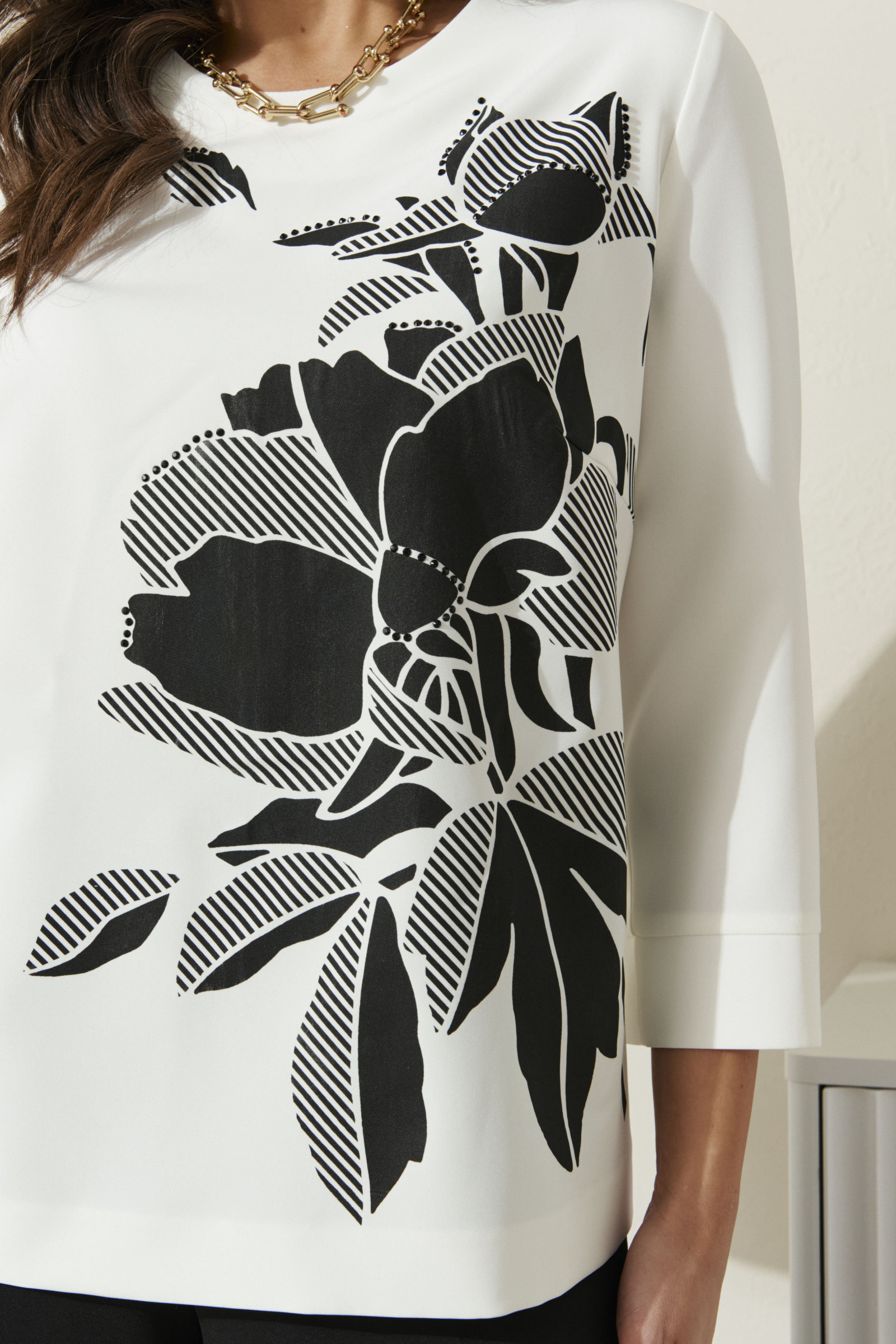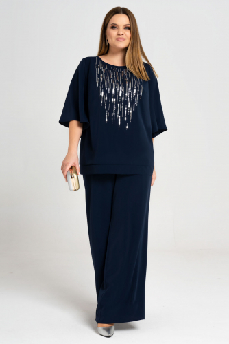Комплект женский из лёгкой ткани для повседневной носки. Блузка прямого силуэта. Перед имеет две нагрудные вытачки, а также украшен дизайнерской печатью в виде красивого цветка. Спинка со средним швом и небольшой застёжкой молнией. В среднем шве имеются небольшие разрезы. Горловина обработана обтачкой. Рукава втачные длинные, низ рукава обработан притачной манжетой. Брюки прямого силуэта. Верхний срез брюк обработан притачным поясом со вставкой на резинке в задней и боковой части брюк. Застежка в брюках располагается в боковом шве, так же в боковом шве имеются карманы с подкройным бочком. Очень красивый комплект, в котором вы обязательно будете стильно смотреть. Данный комплект отлично будет скрывать все недостатки и будет подчеркивать только ваши достоинства.