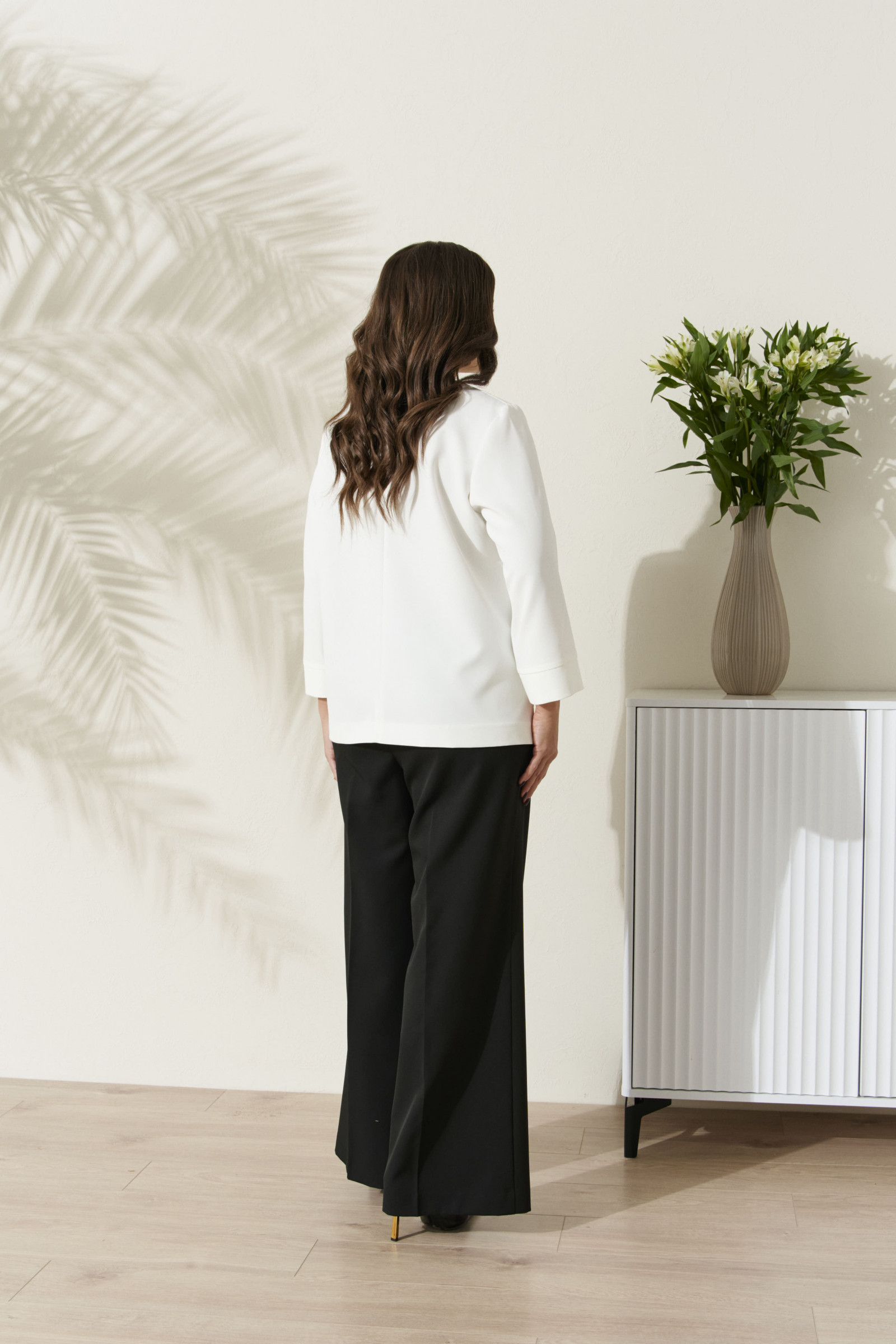 54 Блузка: Длина изделия по спинке - 63см, Длина рукава - 52см, Ширина по груди - 60см, Ширина по низу - 69см, Ширина по талии - 60см, Ширина рукава вверху - 21.5см, Ширина рукава внизу - 19см; Брюки: Длина брюк с поясом - 110см, Длина по внутреннему шву - 82см, Ширина по бедрам - 60см, Ширина по талии - 47см;