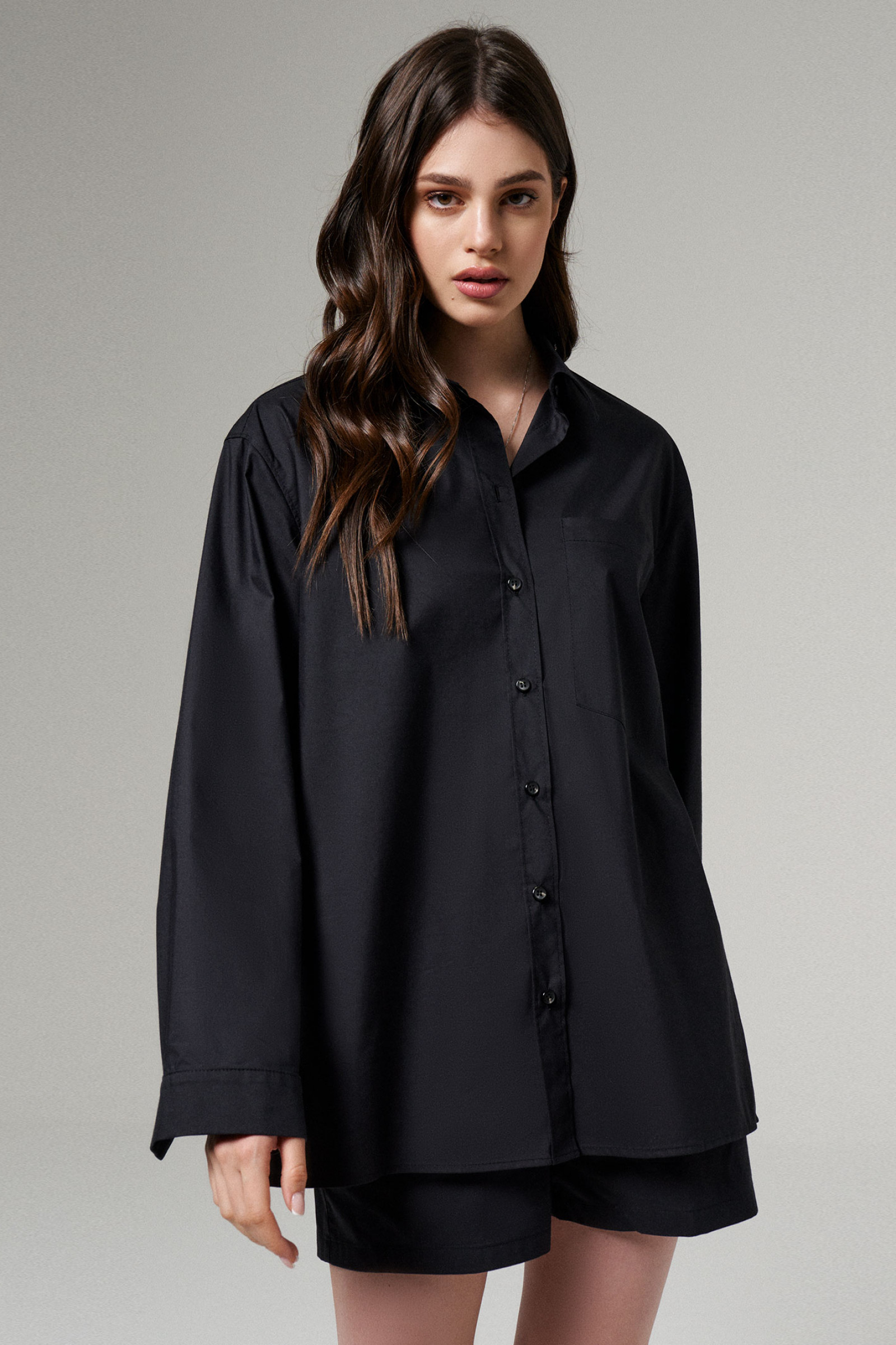 Комплект женский из хлопковой ткани для повседневной носки. Комплект состоит из шорт и блузы. Блуза свободная прямого кроя с фронтальной бортовой застежкой на пуговицы и воротником- стойкой. По переду блузы накладной карман. По спинке отрезная кокетка. Рукав длинный оформлен притачной манжетой. Шорты свободные, на резинке, что очень удобно. Шорты длиной выше колена. Отличный вариант для жарких дней.