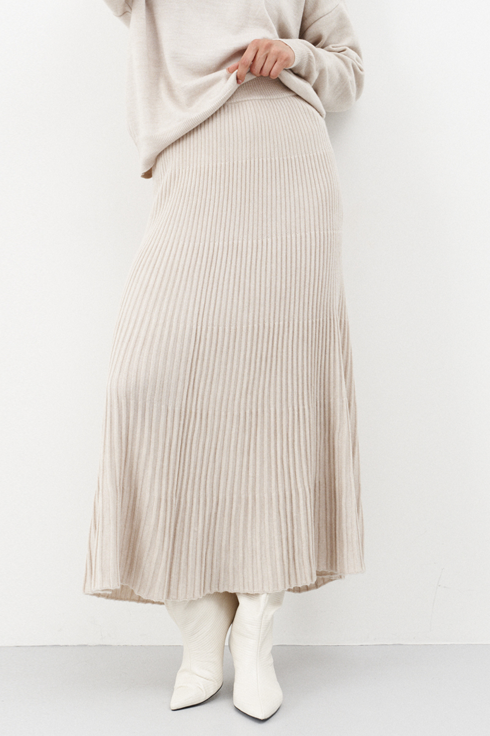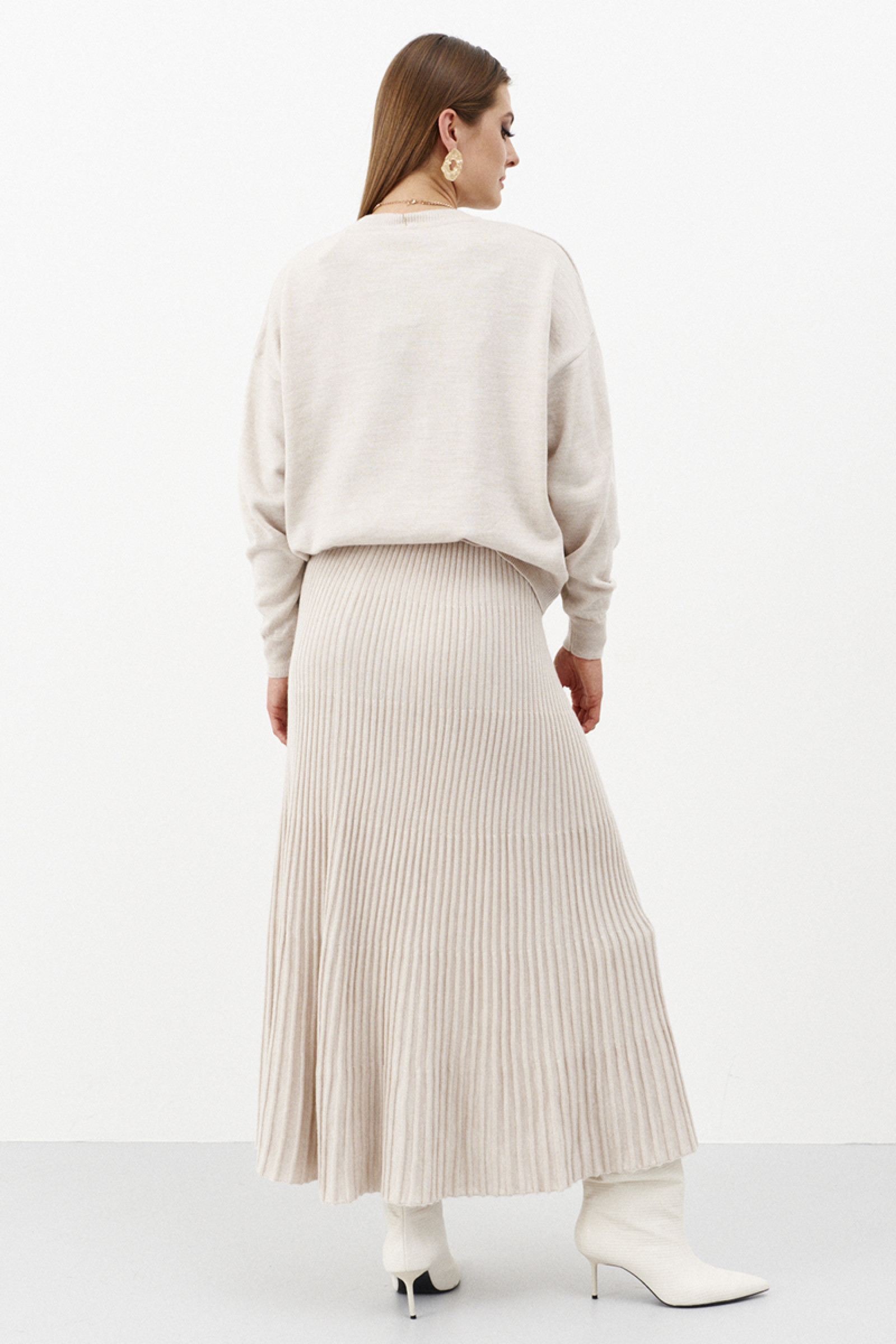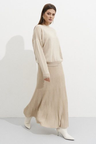 Комплект женский из смесовой вязаной пряжи для повседневной носки прямого силуэта. Джемпер имеет спущенную линию плеча. Низ джемпера имеет пояс на слегка тянущимся довязе. Горловина обработана со слегка тянущимся довязом. Рукава длинные, низ рукава обработан манжетой со слегка тянущимся довязом. Юбка плиссированная. Длина юбки макси. Отличный комплект на любое время провождение. А также данный коплект подчеркнет все достоинства вашей прекрасной фигуры.