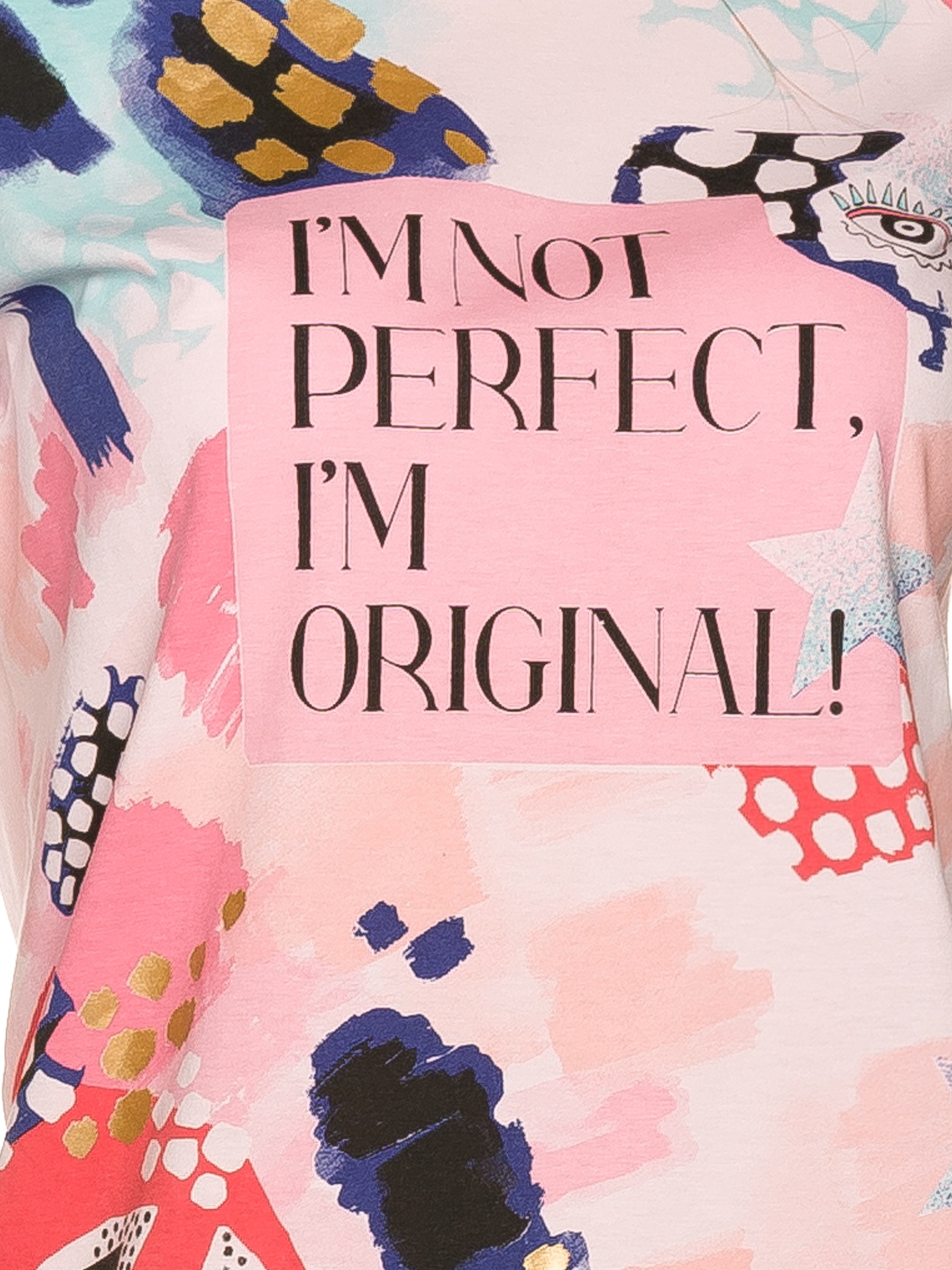 Состав: верх: 57%хлопок 38%полиэстер 5%эластан, низ: 57%хлопок 38%полиэстер 5%эластанОписание: Комплект женский футболка и бриджи. Футболка прямого кроя среднего объема. Мягкий стойкий принт с золотым металликом. Перевод Я не идеальная, я оригинальная.. Бриджи комфортного объема. По талии на плоской внутренней резинке, по низу манжеты шириной 7 см., all over принт.