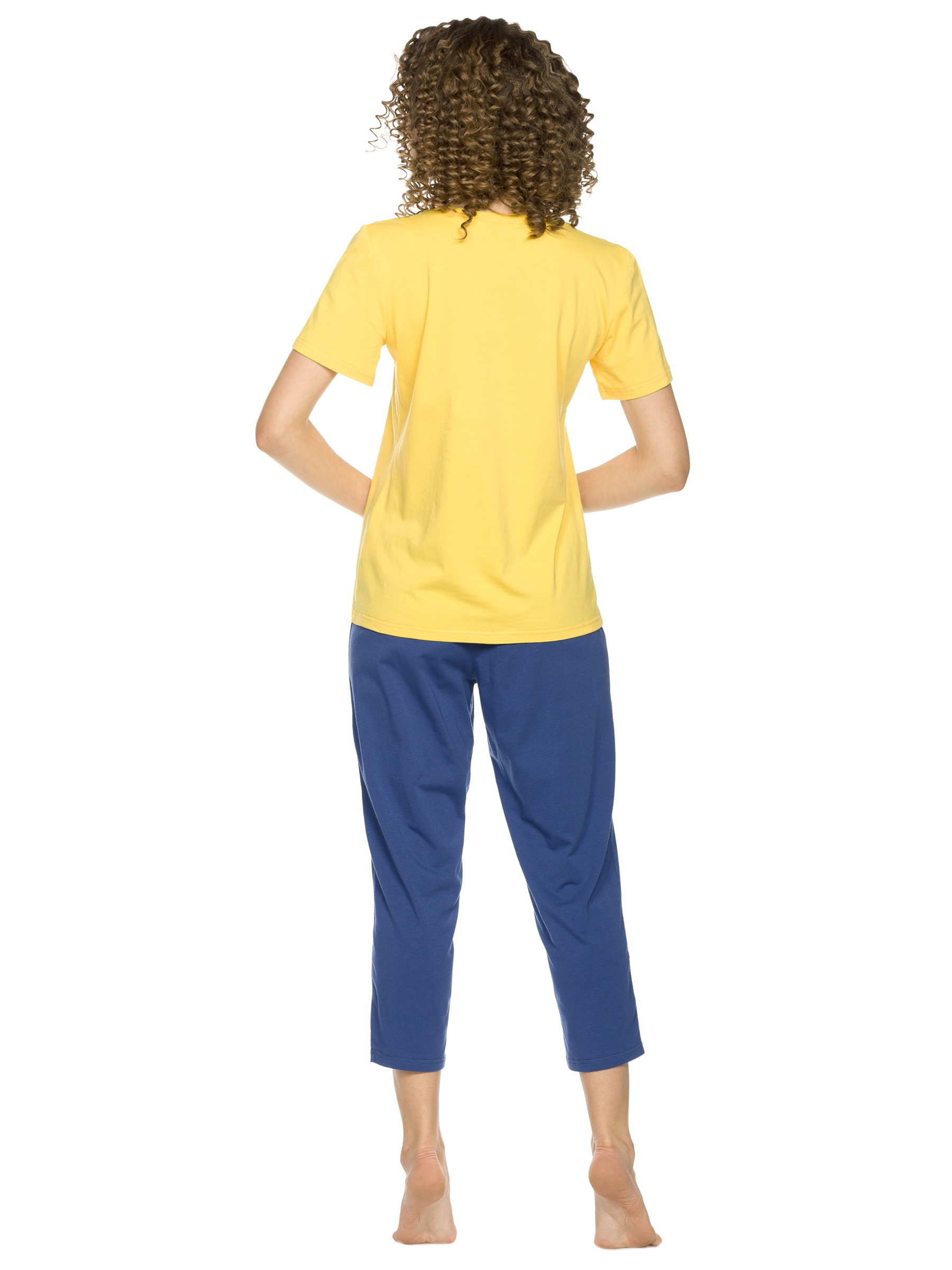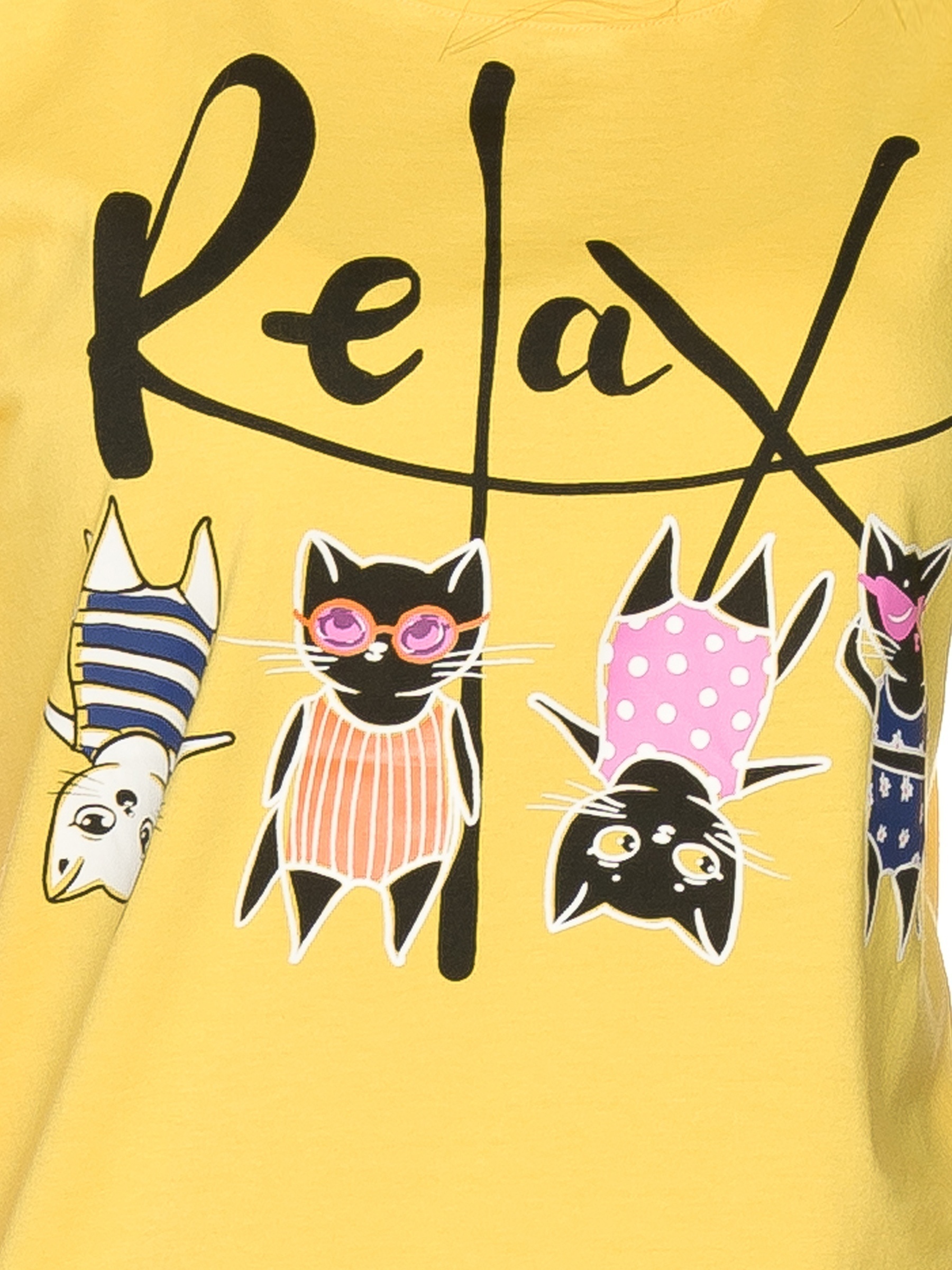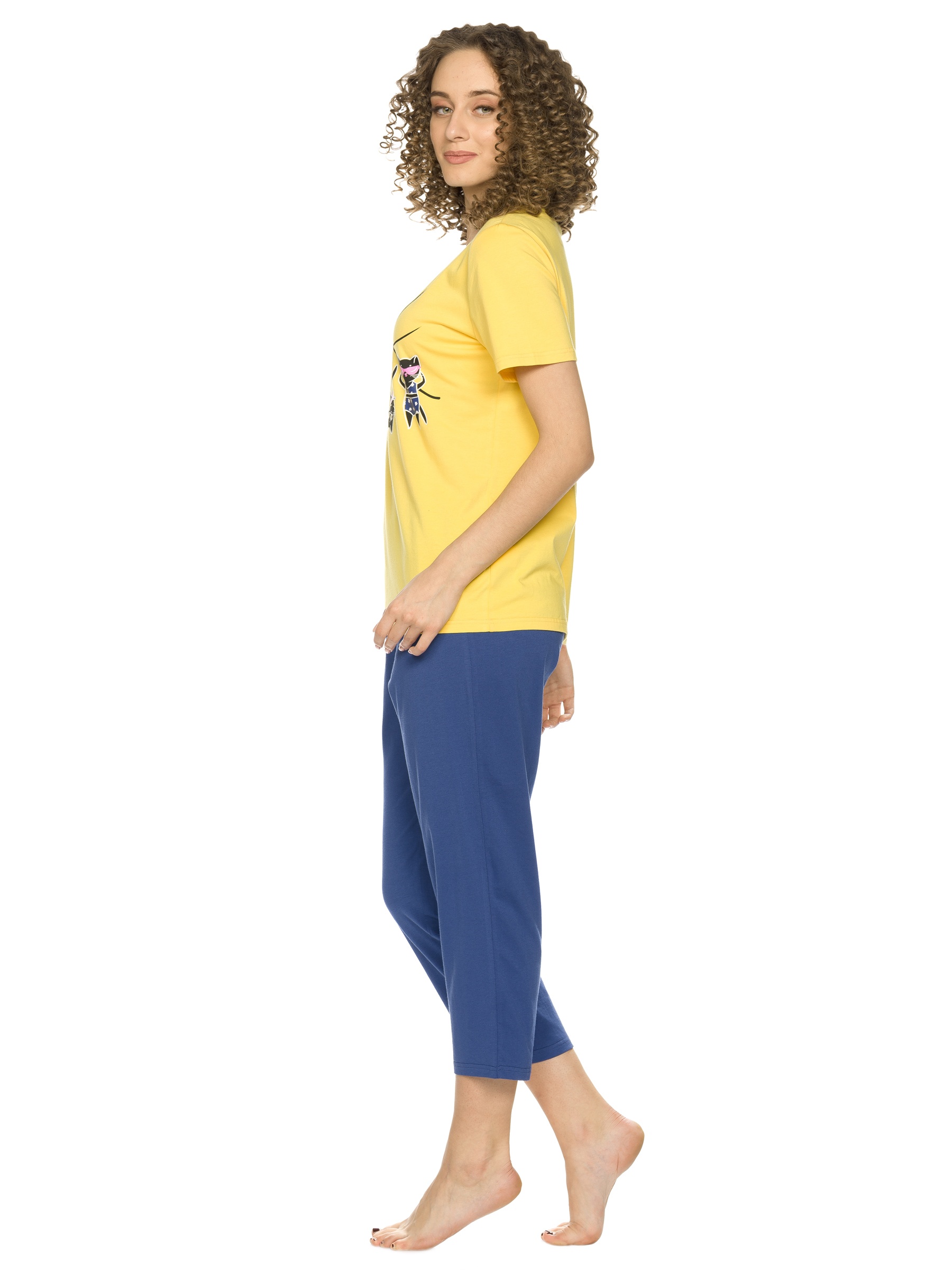 Состав: верх: 95%хлопок 5%эластан, низ: 95%хлопок 5%эластанОписание: Комплект женский футболка и брюки. Комфортная футболка среднего объема. Стойкий эластичный неоновый принт. Перевод Расслабься. Бриджи прямого кроя с небольшим сужением книзу, без манжет.