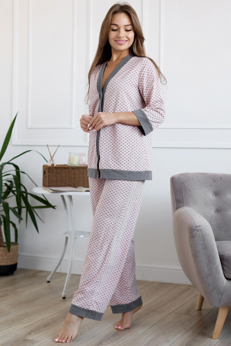 Нежный и мягкий женский комплект из 100% хлопка. Состоит из кофточки на пуговицах свободного кроя и легких, широких брюк. Красивое цветовое сочетание подчеркивает женственность своей обладательницы. Отличный подарок для подруги, сестры, мамы на любой праздник.