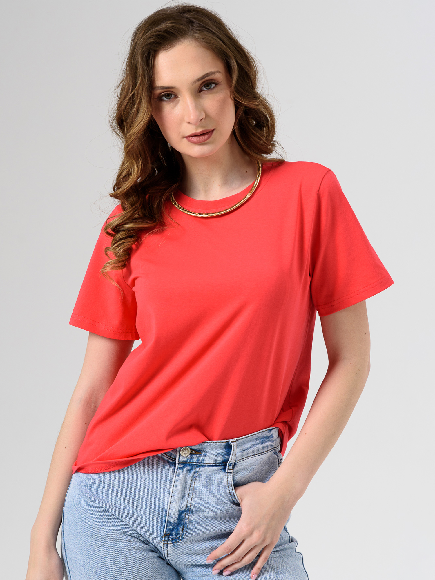 Футболка  женская базовая однотонная, полуприлегающего силуэта, выполнена из трикотажного х/б полотна с лайкрой . Короткий втачной рукав.