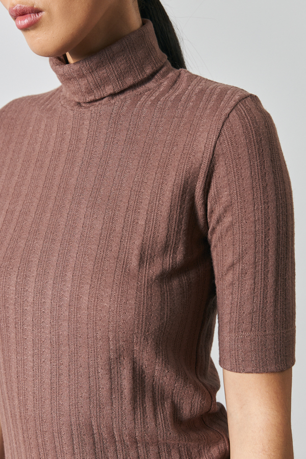 Джемпер прилегающего силуэта из фактурного эластичного полотна. Втачной короткий рукав. Вырез горловины высокая стойка. Джемпер – это хорошая базовая вещь, подходящая для любого гардероба.