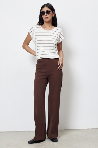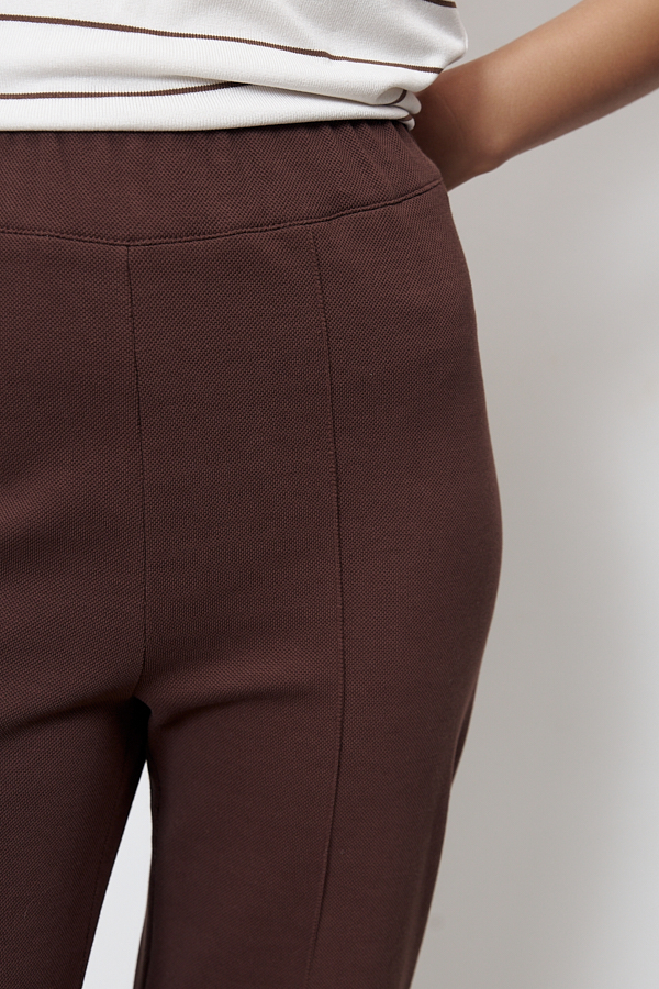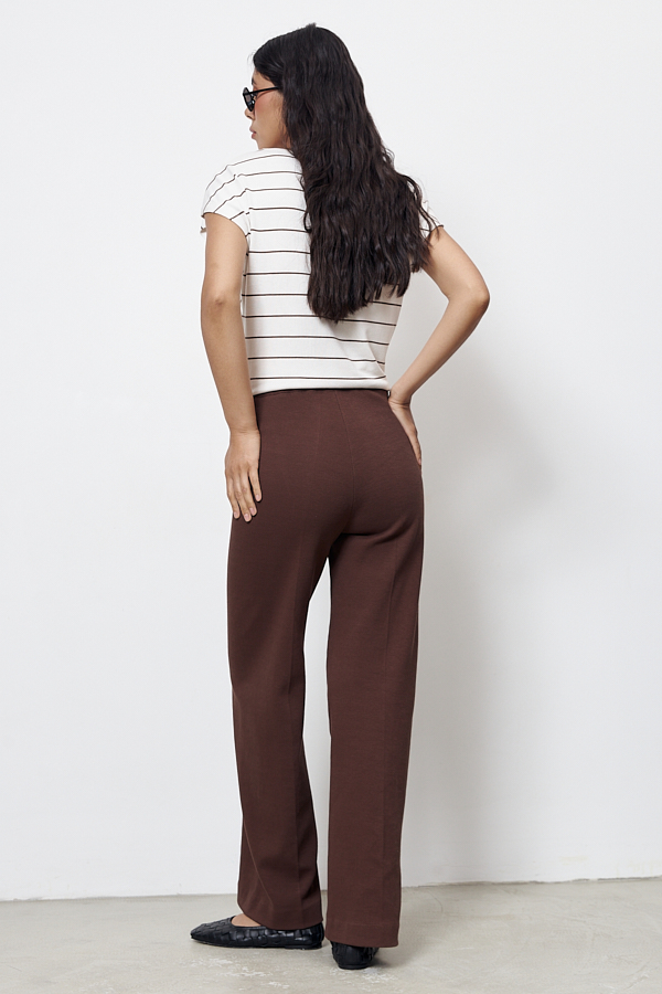 Брюки из эластичного полотна прямого силуэта. Пояс с эластичной резиной. На передней части брюк застрочены стрелки.