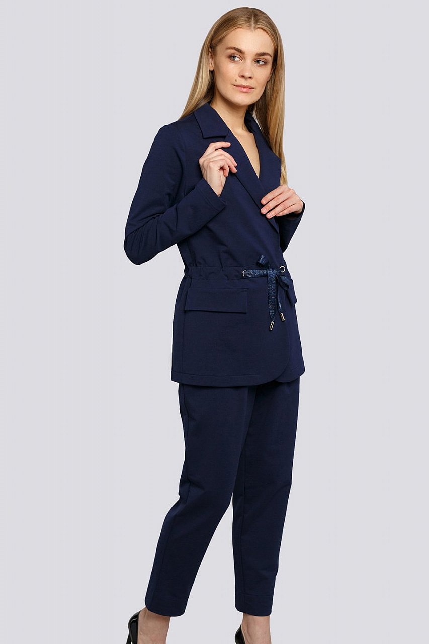 Использование современных брючных костюмов позволяет визуально улучшить фигуру и усилить восприятие стройности. В таком наряде каждая дама сможет подчеркнуть сильные стороны своего телосложения и спрятать недостатки. Стильный брючный трикотажный костюм – отличный вариант деловой одежды. Он придает женщине стройности и добавляют женственность и привлекательность внешнему облику. Жакет свободного кроя с воротником пиджачного типа. Талия подчеркнута кулисой с тесьмой. Застежка на потайную кнопку. Брюки с высокой посадкой и складками на талии. Пояс на резинке. По низу брюк можно отвернуть манжеты. Состав трикотажа: 75% хлопок, 20% полиэстер, 5% спандекс.