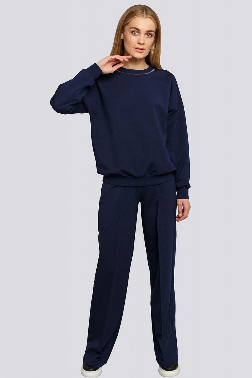 Костюм в стиле спорт шик из трикотажа. Лаконичный, свободный свитшот с серебряной отделкой по горловине. Широкие брюки со стрелками, в боковых швах карманы. Пояс на резинке. Состав трикотажа: 75% хлопок, 20% полиэстер, 5% спандекс.